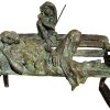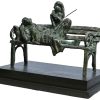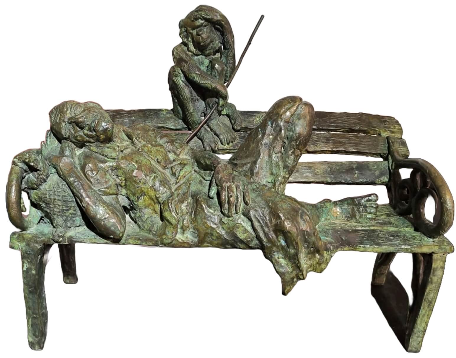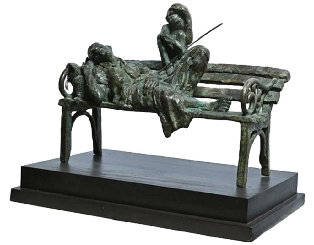 In this bronze sculpture titled “A Madari”, De captures a hauntingly tender moment — a street performer (madari) sits with his monkey on a worn bench, exhausted and contemplative. The composition evokes both bond and burden, highlighting a relationship built on survival and performance. The worn, fragmented quality of the bench and figures underscores themes of poverty, fatigue, and endurance, turning a seemingly mundane street scene into a profound human commentary.