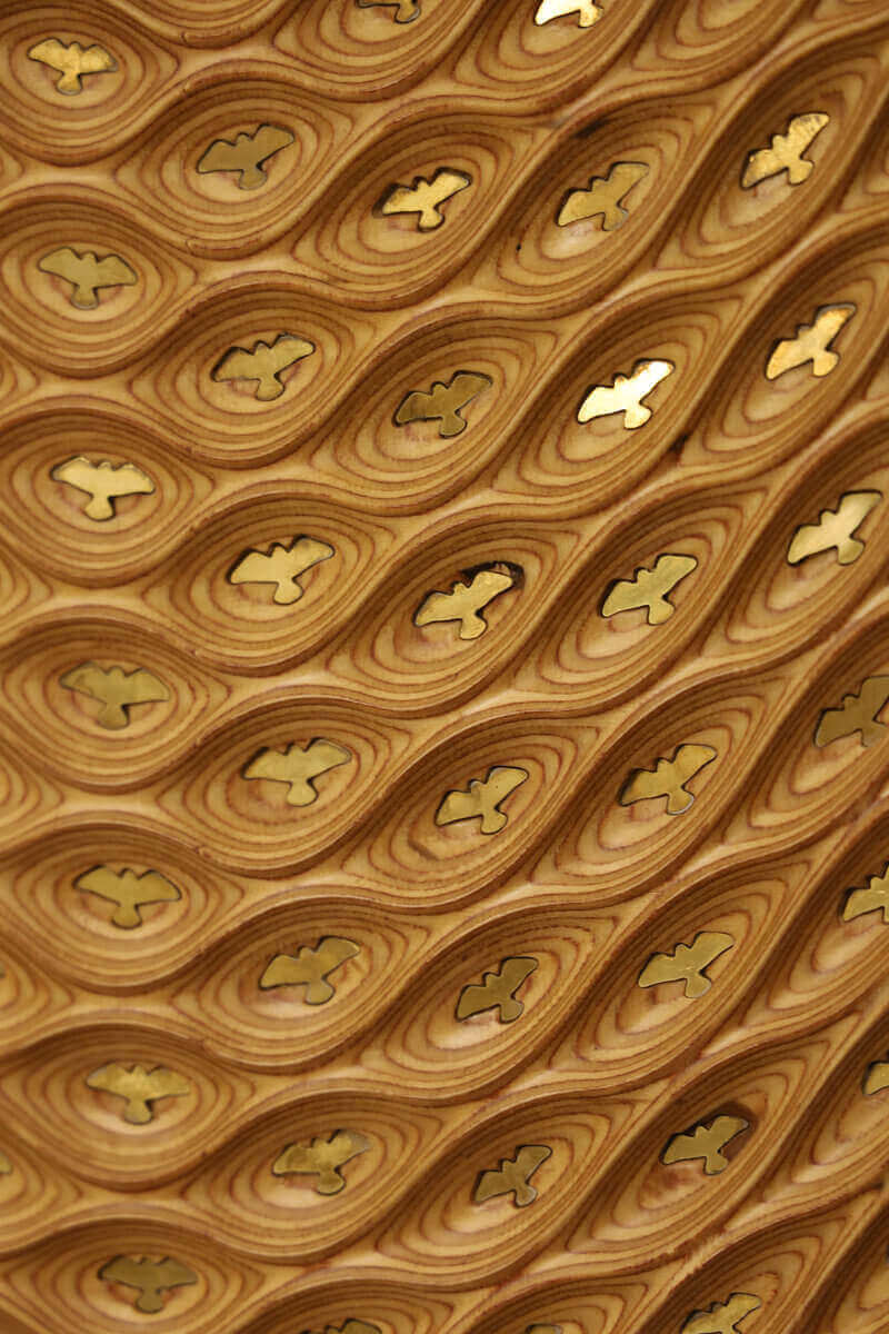 In this piece, the form expands into an elliptical field. The surface flows gently across the plane, guiding the eye from one edge to the other. It carries a sense of quiet momentum — like looking at the sky just before a flock begins to rise. Bird inlays appear gradually across this landscape. Sparse in one area and gathering toward another, they suggest migration without directly illustrating it. Their placement creates direction within the composition — a shift from calm dispersion to collective lift. The brass-finished bird silhouettes introduce reflection into the wall art as viewers move across. As light moves falls on the curved surfaces, the metallic forms catch and respond to it, adding depth and subtle movement. This reflective quality brings a quiet sense of luxury without overpowering the natural warmth of the wood.