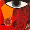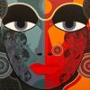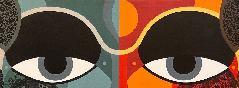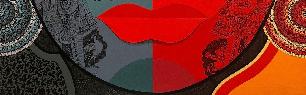 In Ardhanareeshwara, Bolgum Nagesh Goud portrays the confluence of Shiva and Shakti through a vibrant dual-toned face. Richly detailed, the work merges mythology with contemporary form, celebrating balance and divine unity.