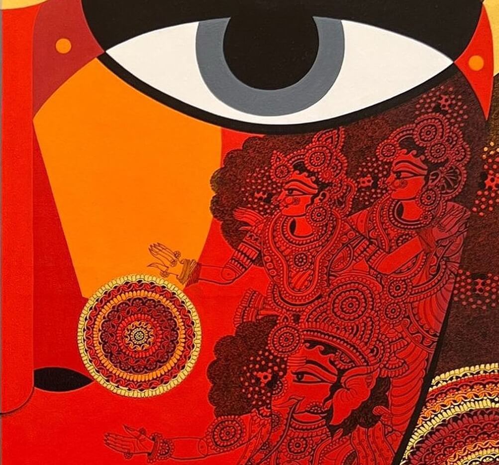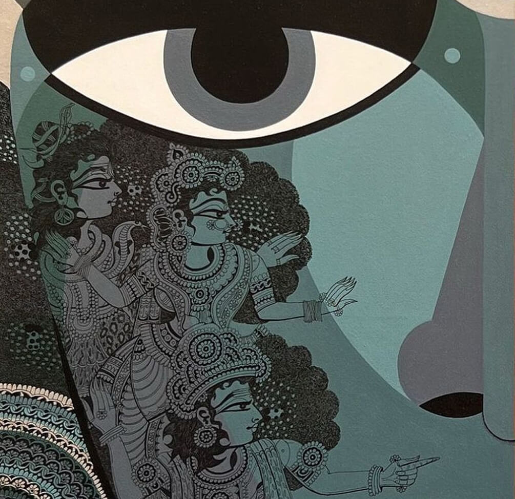This powerful artwork by Bolgum Nagesh Goud, titled “Ardhanareeshwara”, beautifully represents the divine union of Shiva and Parvati — the masculine and feminine energies of the cosmos. Using metallic acrylic and ink on canvas, the artist splits the face symmetrically into cool and warm tones, emphasizing duality and balance. Intricate miniature figures on either side narrate mythological scenes, symbolizing harmony, unity, and the indivisible nature of male and female principles in Indian philosophy.