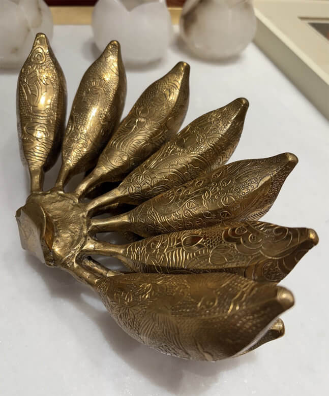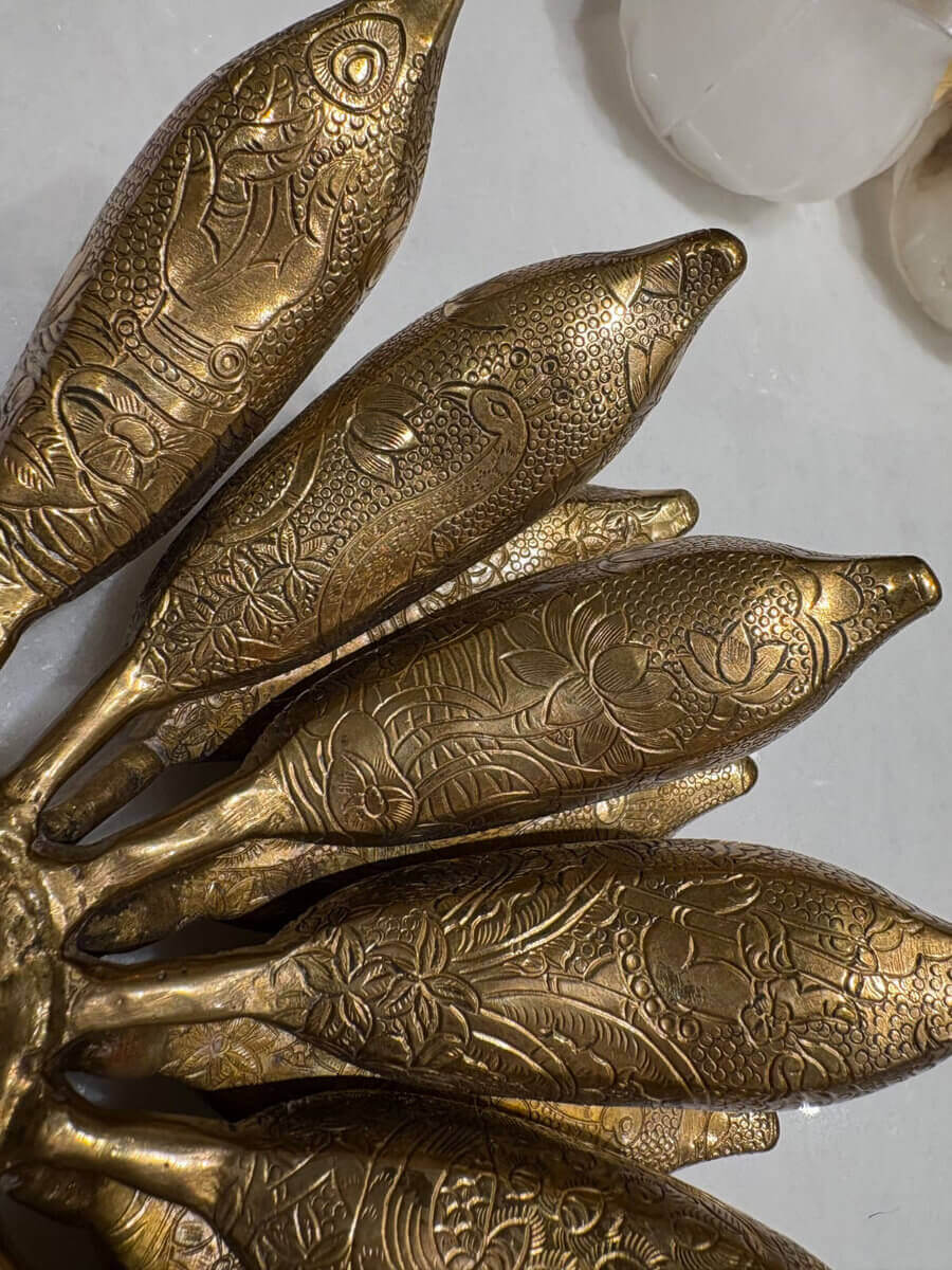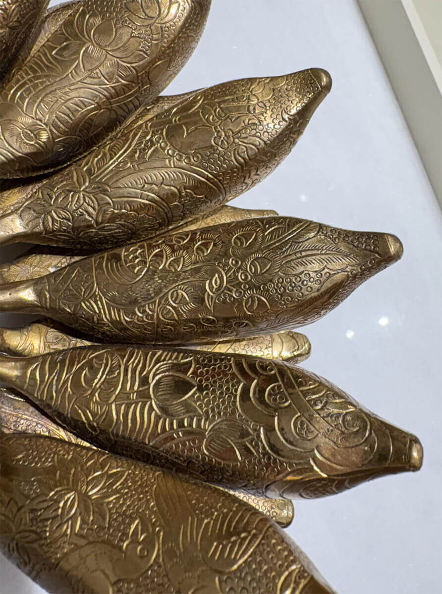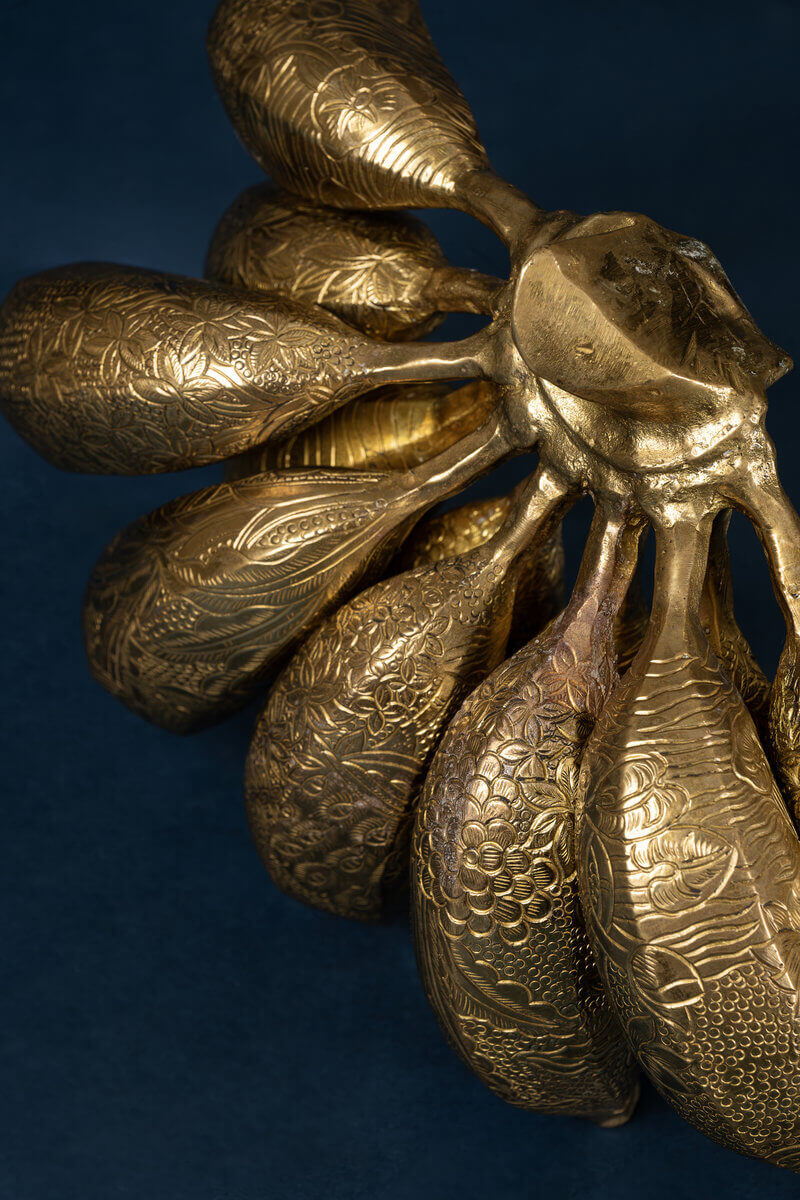 Deeper into the themes of memory, material, and tradition, reinterpreting the revered art of Pichwais through intricate sculptural forms. Drawing on his deep connection to nature and spirituality, he uses traditional Repoussé and Chasing techniques to translate textile-like fluidity into the permanence of brass. These works form a layered narrative that blends personal history with divine imagery, continuing a dialogue that has shaped his multidisciplinary practice. This new body of work mirrors the meditative attention of his earlier embroidery — where each stitch carried significance. Now, each engraved surface, each raised form in metal, becomes an extension of that same admiration and sensitivity.
