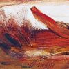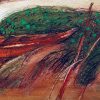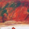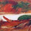 In this composition, a lone wooden boat rests near the bank of a river, surrounded by lush greenery and rust-toned terrain. The scene exudes stillness, with an undercurrent of movement suggested by bold, sweeping lines and textured strokes. The boat, painted in earthy reds and browns, becomes a poignant symbol—perhaps of journey, waiting, or solitude.