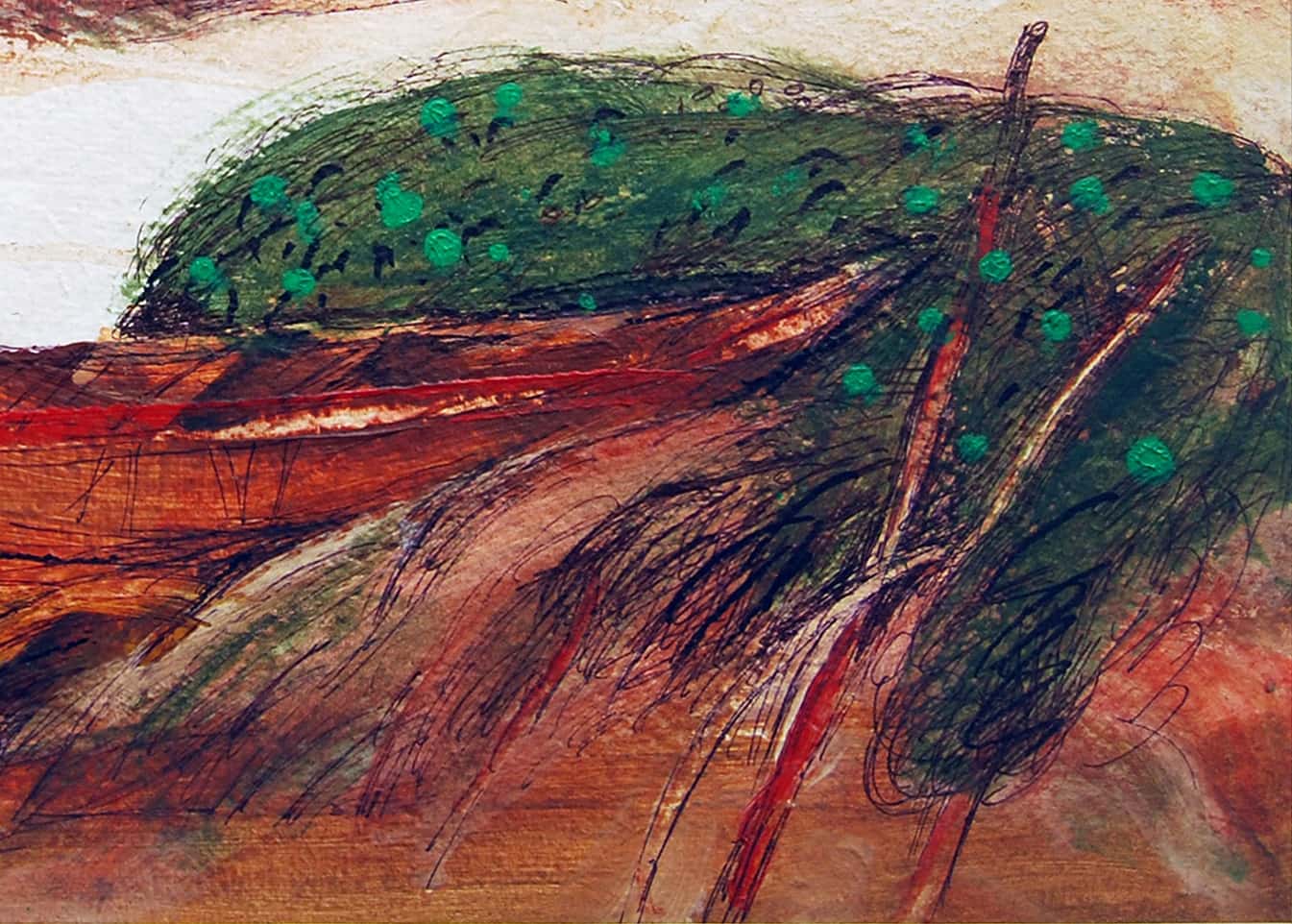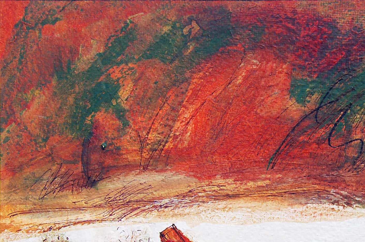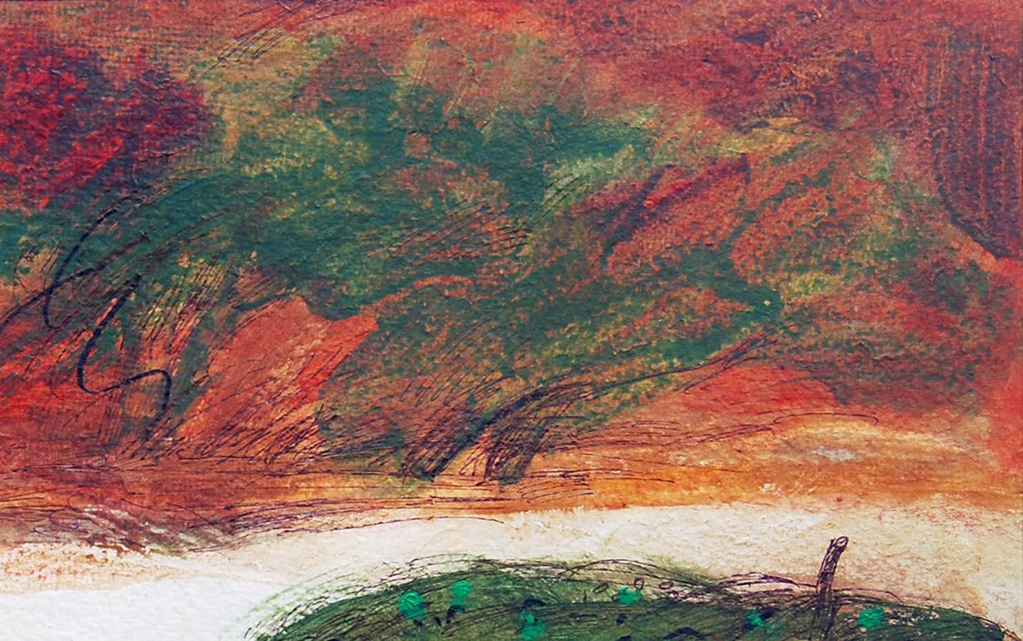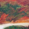 The intense, warm color palette, with overlays of red, orange, and green, evokes the fertile lands of Bengal, while the layered mixed media technique adds depth and dynamism to the piece. The brushwork is free yet intentional, conveying both the rawness of nature and the emotional undertone of human presence.