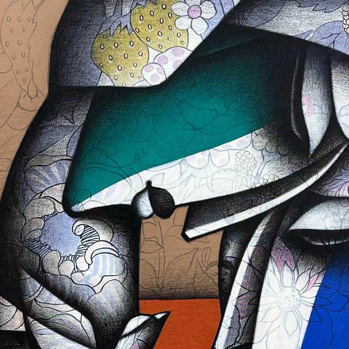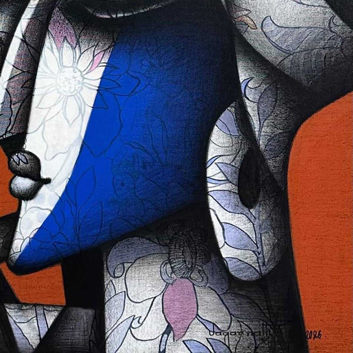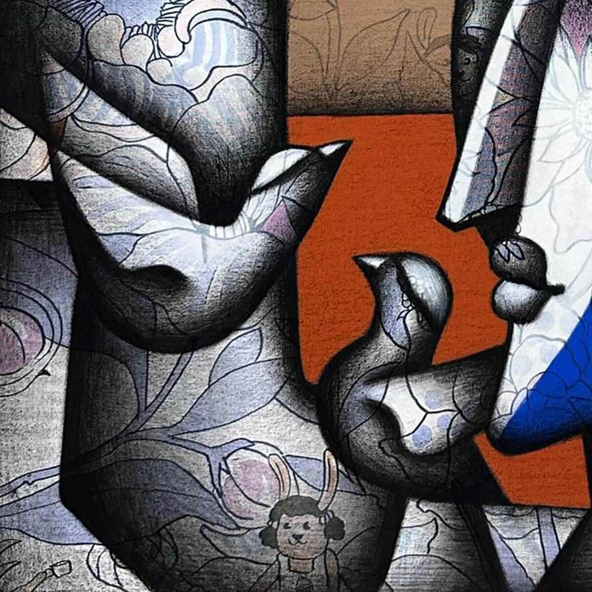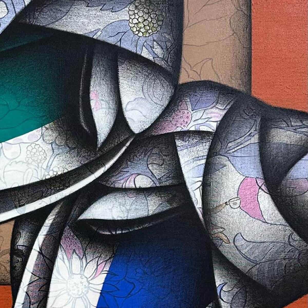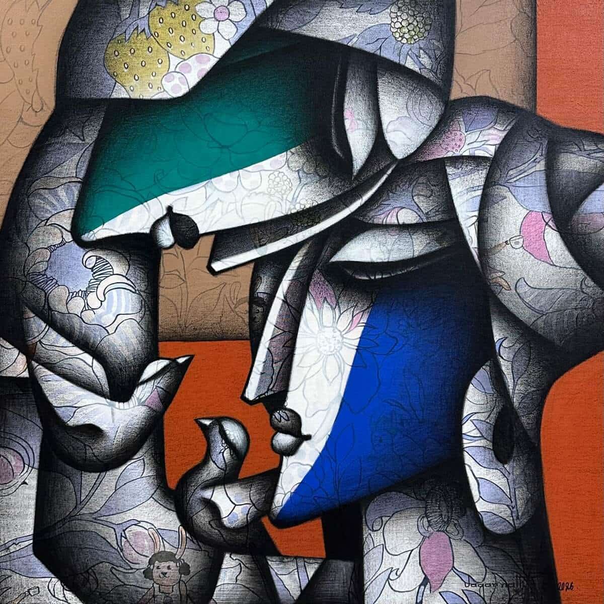 Rendered in a Cubist-inspired aesthetic, the composition is built from fragmented planes and soft curves that interlock seamlessly. The use of charcoal creates depth, shadow, and a tactile quality, while acrylic hues—notably deep blues, warm oranges, and subtle greens—introduce emotional contrast and vibrancy. Delicate floral and organic patterns embedded within the forms add a quiet narrative of growth, nurturing, and continuity.