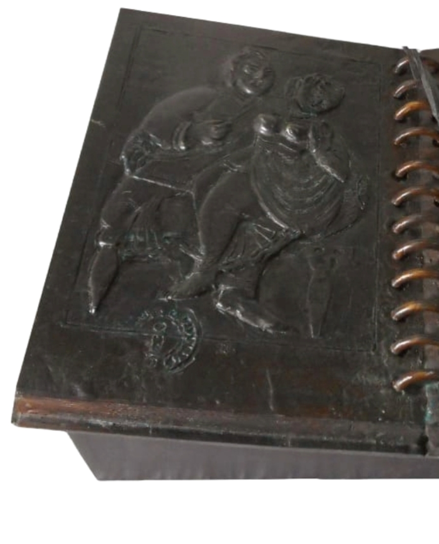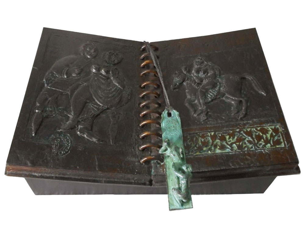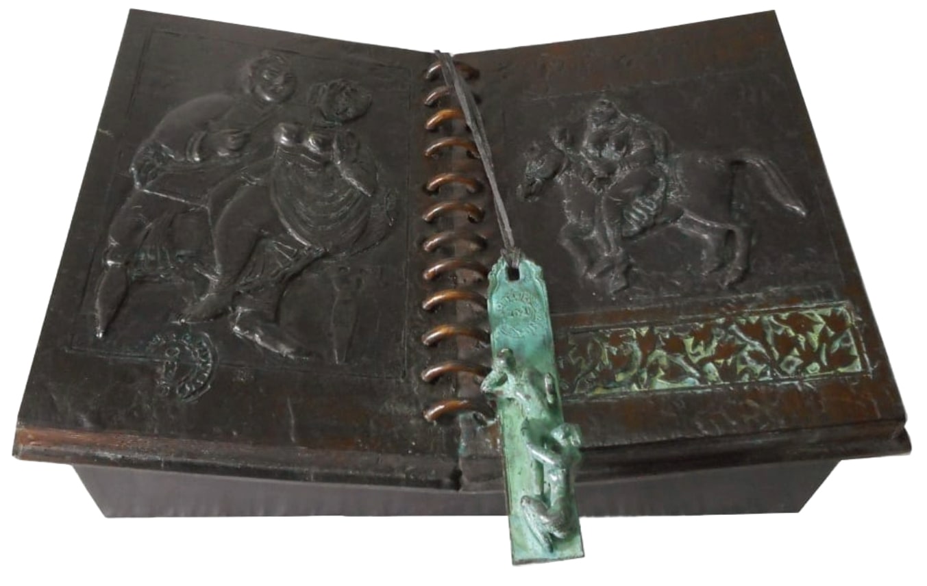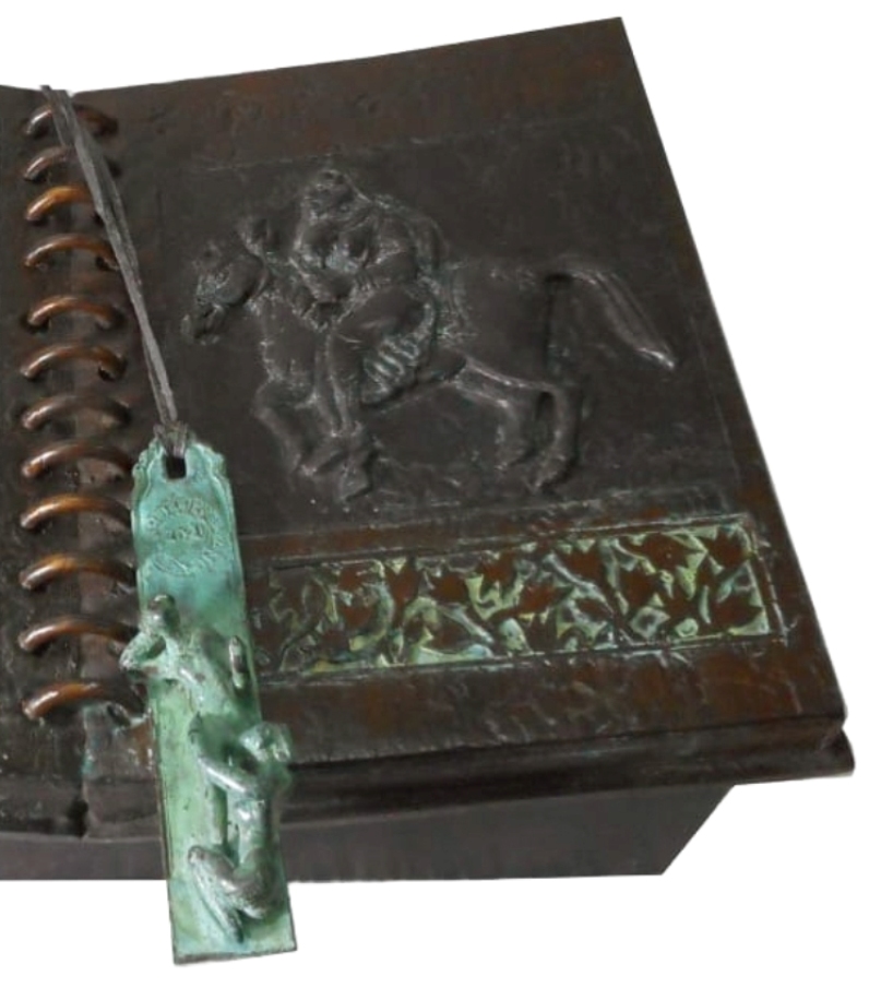 This bronze sculpture, titled Book (2021) by Barun Pramanick, is a compelling fusion of narrative, history, and materiality. Designed in the form of an open book, its pages are adorned with embossed reliefs depicting human figures and mythic scenes, suggesting timeless stories of culture, folklore, and memory. The spiral spine at the center adds to its realism, while a patinated bookmark, sculpted with miniature details, dangles across the pages, reinforcing the sense of continuity between past and present. The use of bronze lends permanence to what is usually fragile and temporal, making the book a symbol of enduring knowledge, tradition, and human experience.