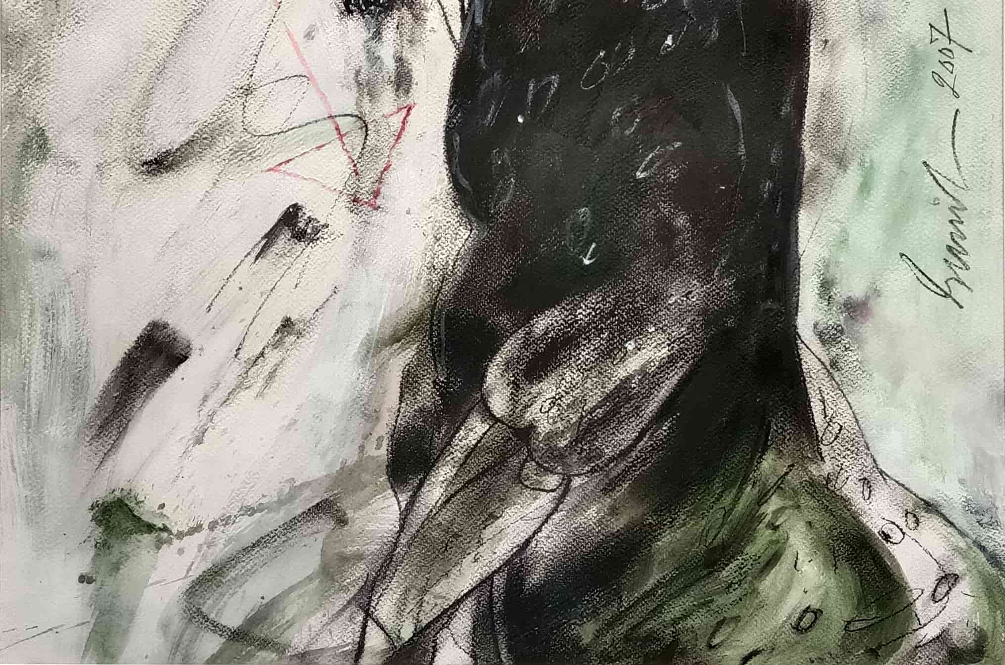 In this 2007 artwork titled “Bull”, Sunil Das captures the raw energy and primal strength of the animal through bold brushwork and expressive lines. The bull dominates the composition with its muscular form and intense gaze, rendered in deep blacks and textured shades. The abstract elements — such as the red arrow, scratched lines, and gestural strokes — heighten the tension and emotion in the piece. The overall treatment gives the bull an almost mythic presence, a frequent theme in Das’s exploration of vitality and struggle.
