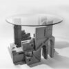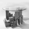 This composition forms a centre table, where a glass top is supported by three architectural towers. The fragments act as structural elements, translating the language of architectural mass and proportion into a functional object.