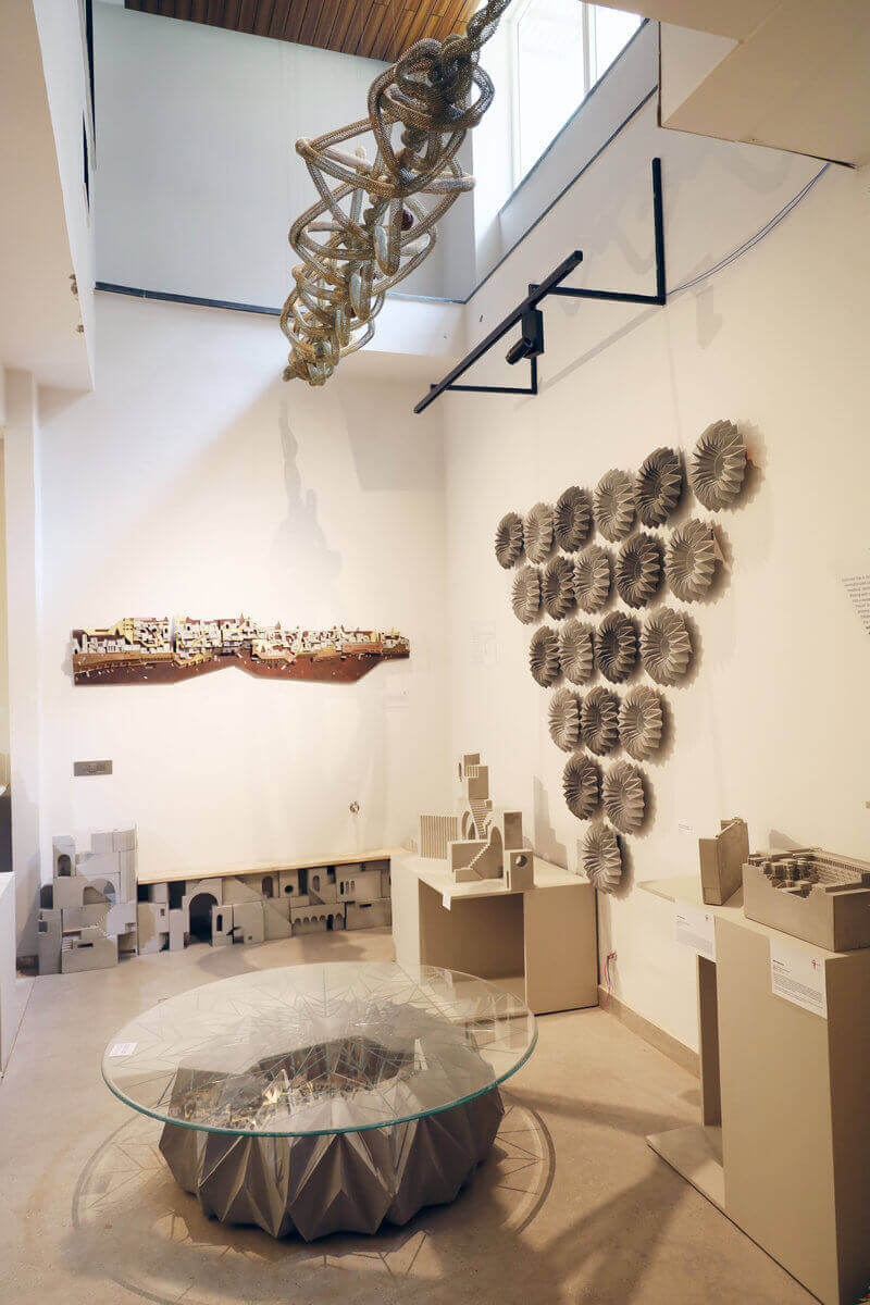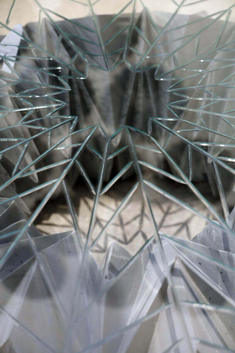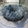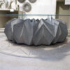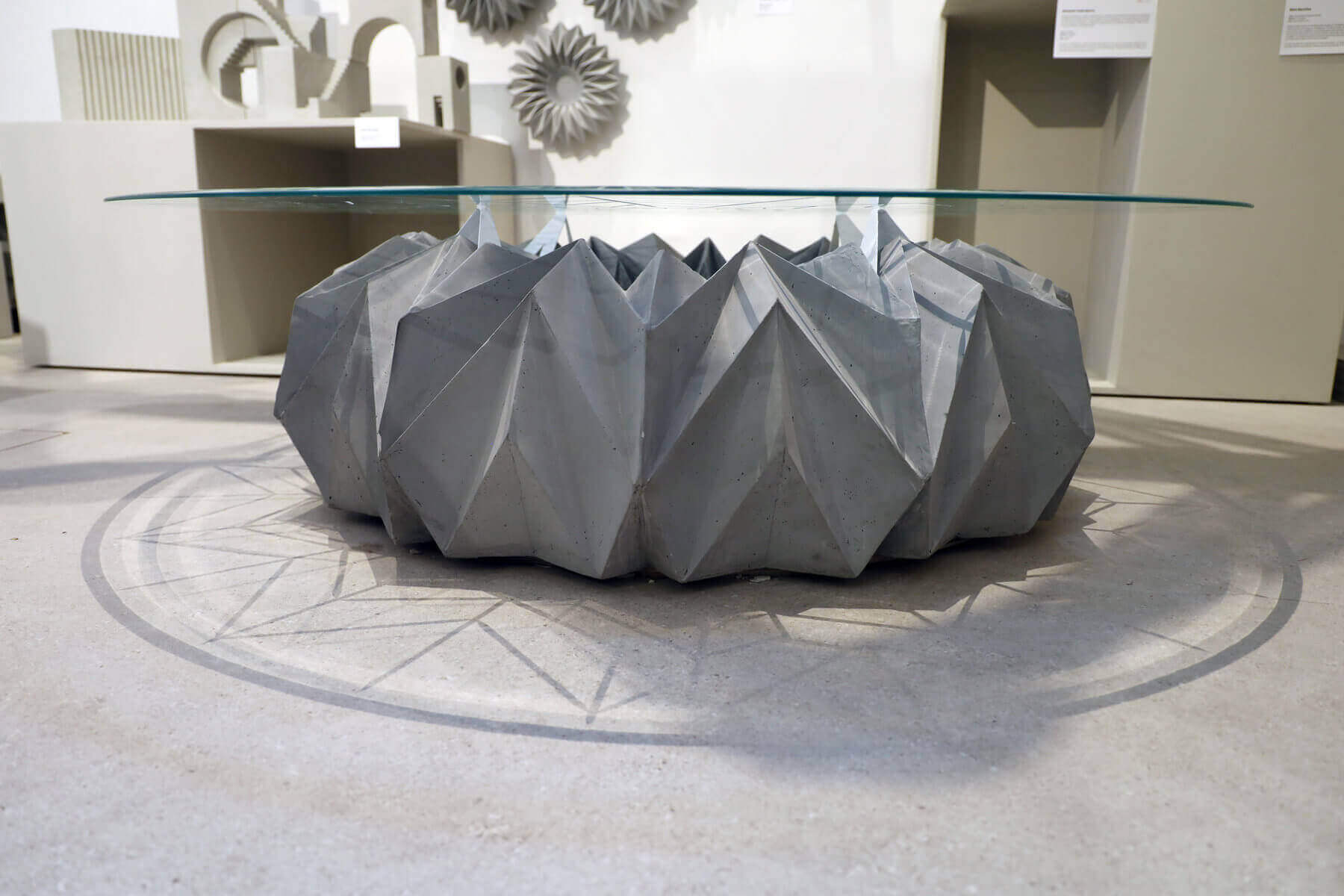 The Concrete table reveals the geometry of a toroidal form in 2D in the etching of the glass top and then extrapolates the drawing into the 3D base. Concrete is often perceived as an architectural material. This then is a work of architectural sculpture in miniature, just as an architectural plan manifests into built forms.