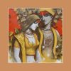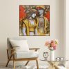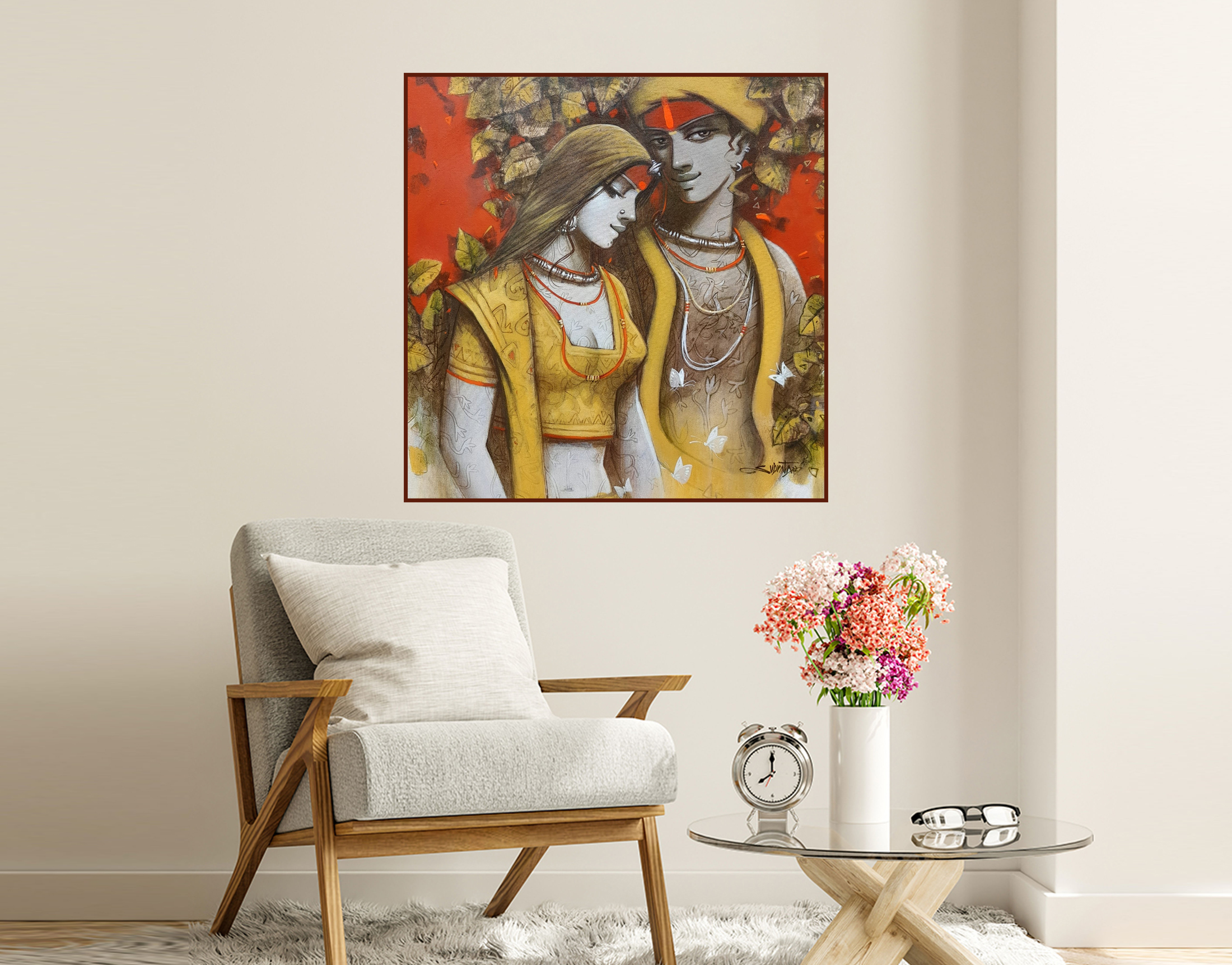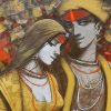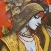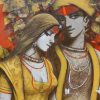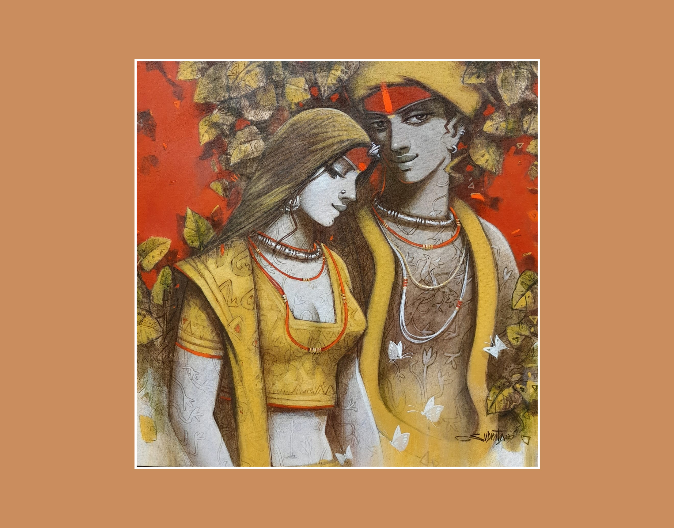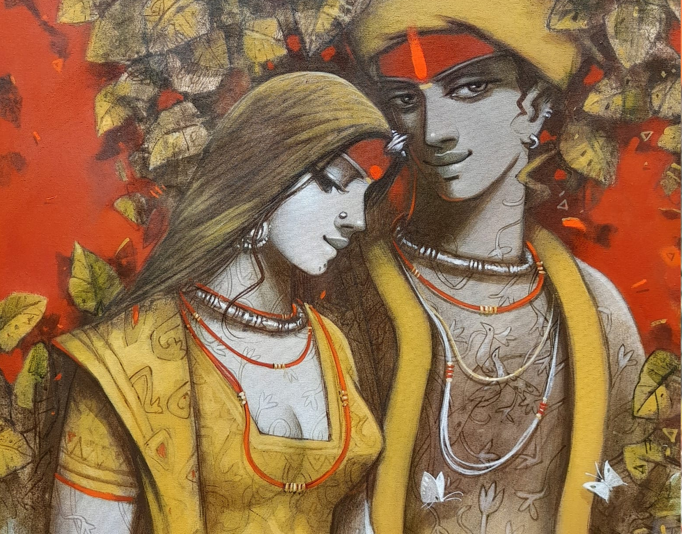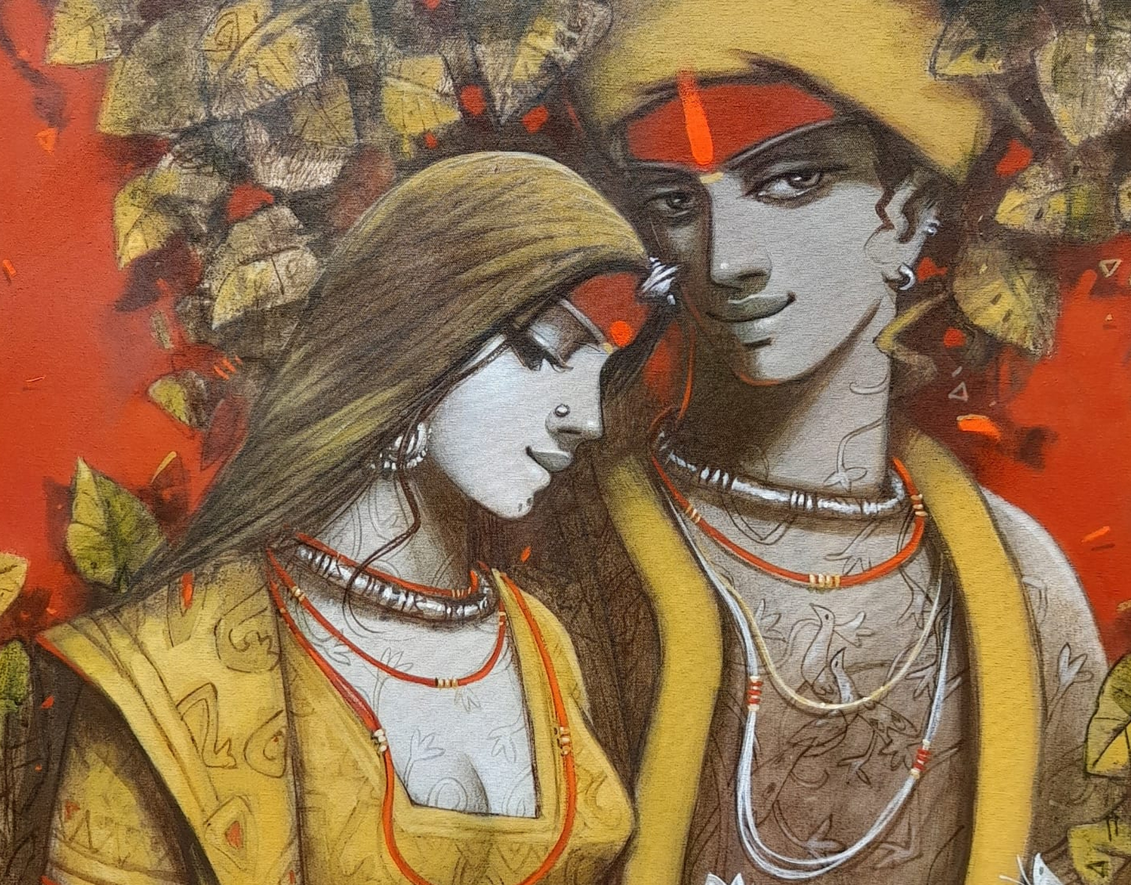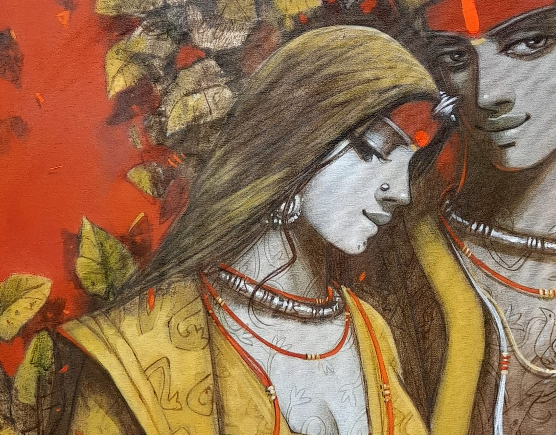 The painting features depicted Couple, their faces obscured from view. Adorned with intricate tattoos or body paint, they wear jewelry including necklaces and bracelets. One figure holds a piece of white cloth that drapes down. The vibrant background, a mix of red tones and abstract shapes, creates a chaotic yet harmonious atmosphere. The artist’s signature appears in the bottom left corner, though it’s not clearly readable.
