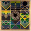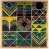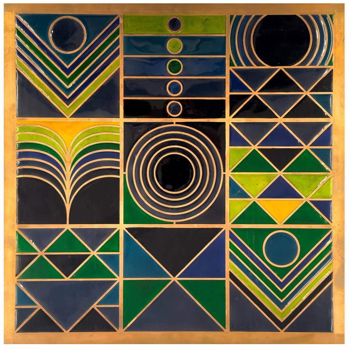 This striking geometric artwork presents a harmonious interplay of form, symmetry, and color. Divided into a structured grid, the composition features a series of bold geometric motifs—including concentric circles, layered arcs, triangles, and linear patterns—each occupying its own distinct panel. The use of deep navy blue as the dominant base is beautifully contrasted with vibrant tones of green, yellow, and subtle gold outlines, creating a sense of depth and visual rhythm.