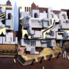 Ghats of Benaras is the wall mural that evokes the timeless essence of the ghats, where steps descend to meet the sacred waters. These stairs defy convention, bending ones perception across dimensions and axes, suggesting pathways to unseen realms. A backdrop of temple elevations and narrow city lanes invoke the lasting spirit of the place.