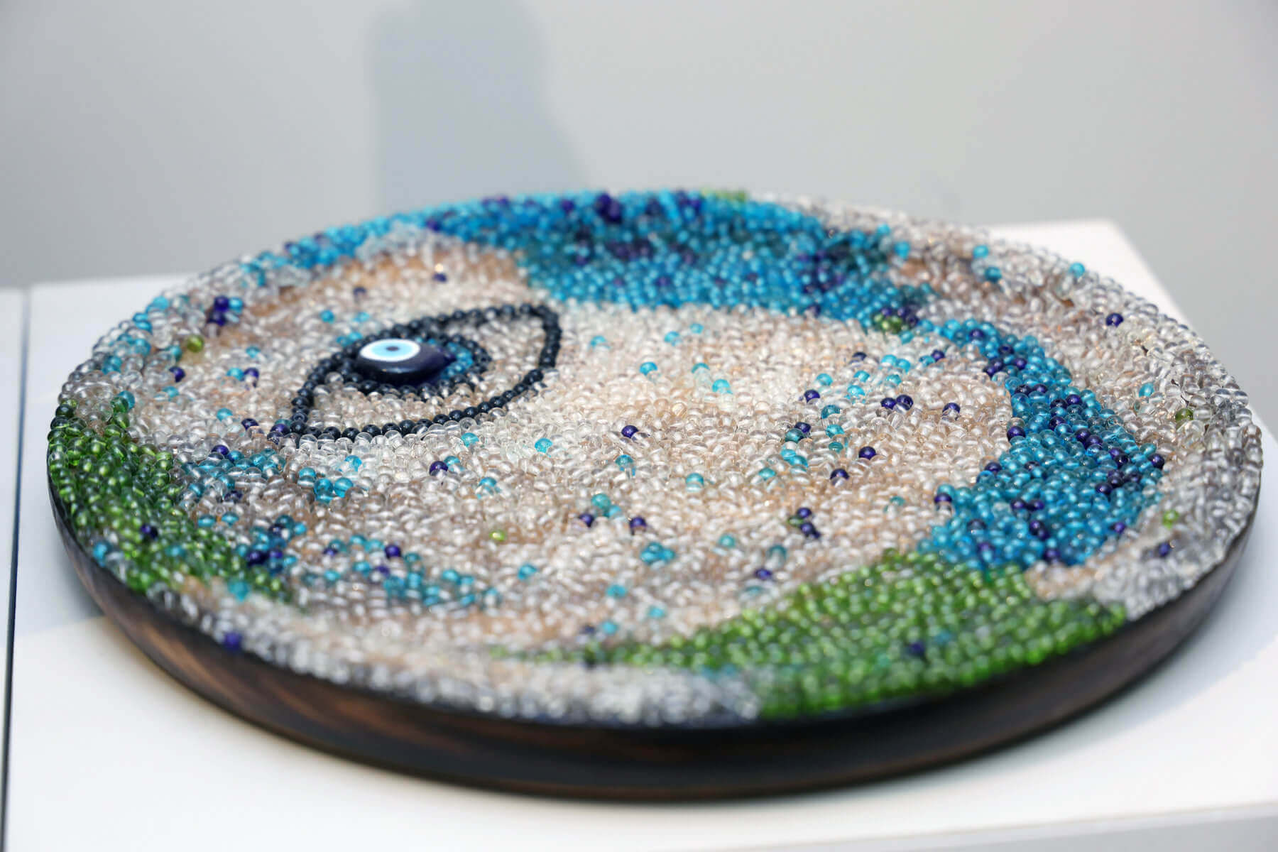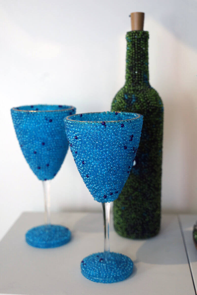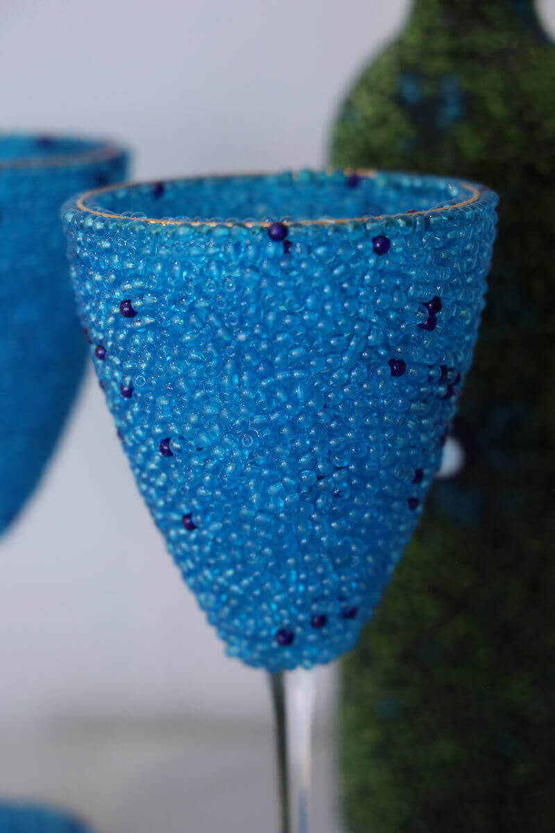 For this exhibition, I work with glass for its natural qualities of transparency, fragility, and attraction, but I am interested in what happens when these expectations are pushed. I begin with familiar glass objects that already carry memory — of use, pleasure, and desire. Through repetitive hand-applied glass beadwork, I gradually alter their surface and weight, shifting glass from something light and transparent into something dense and resistant. Rather than transforming the material through heat, I work with time, touch, and accumulation, allowing labour to guide the final form. In this process, glass retains its fragility while gaining physical and visual weight.