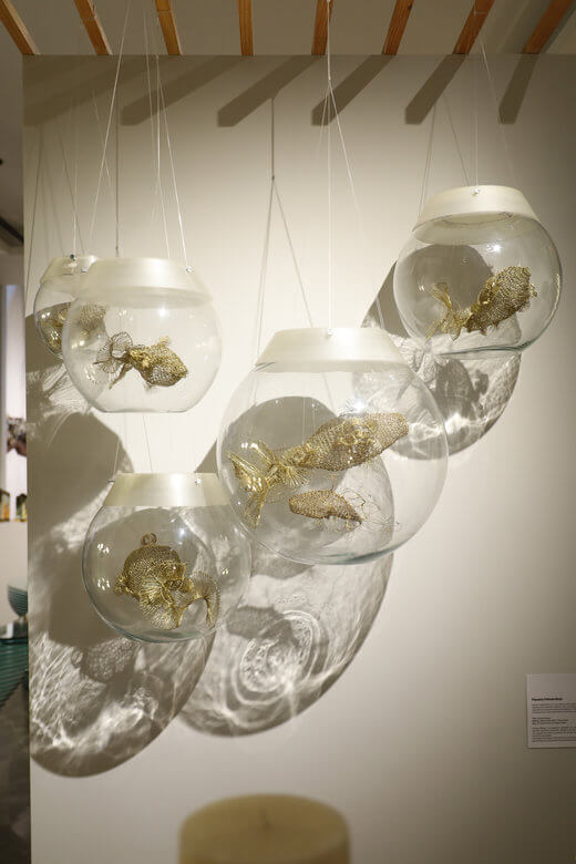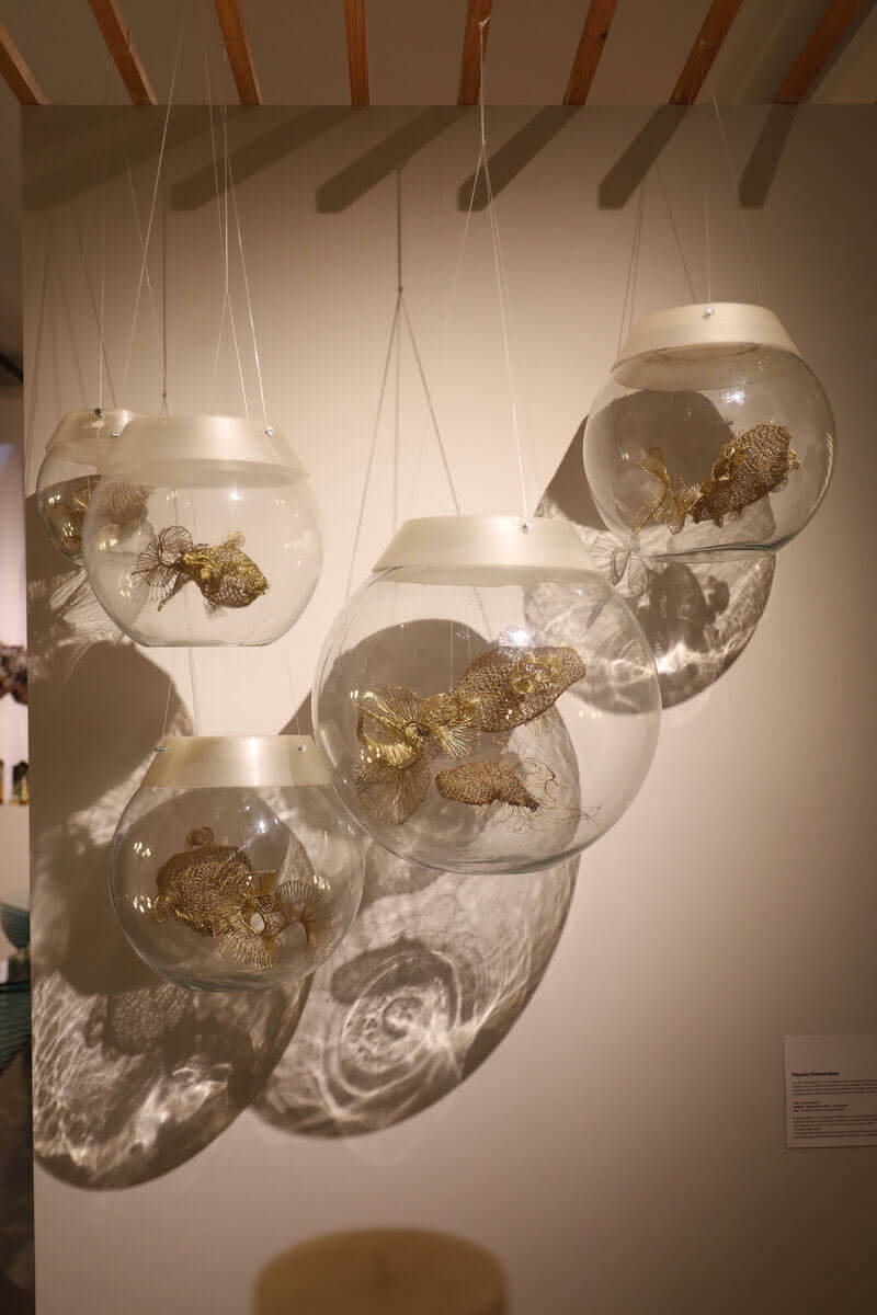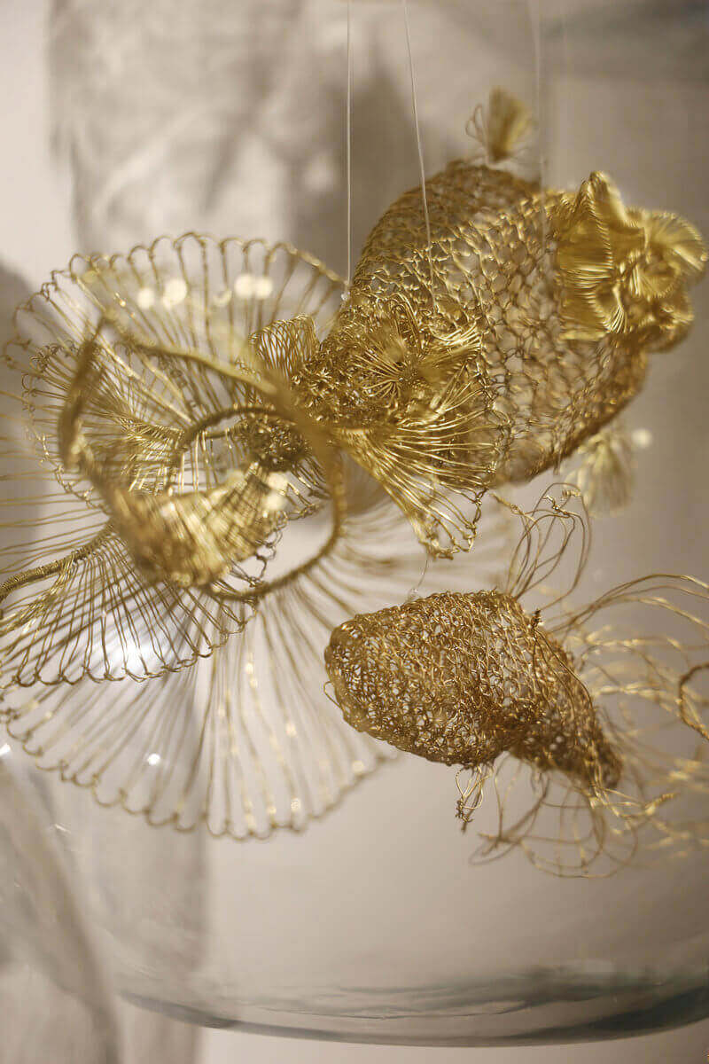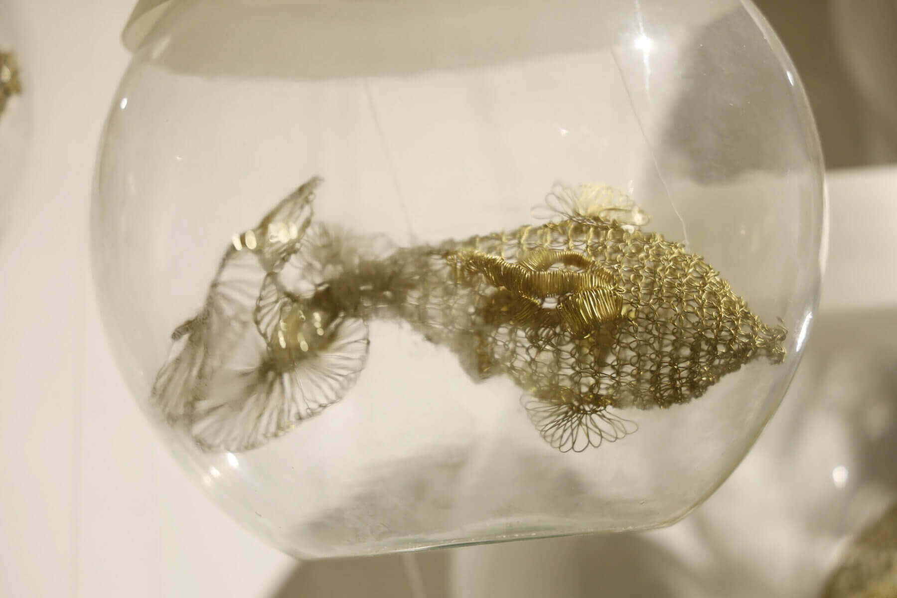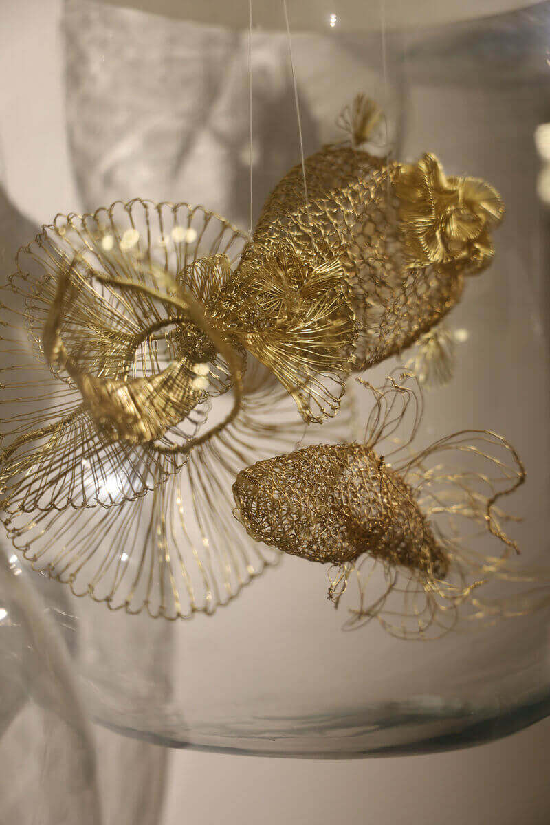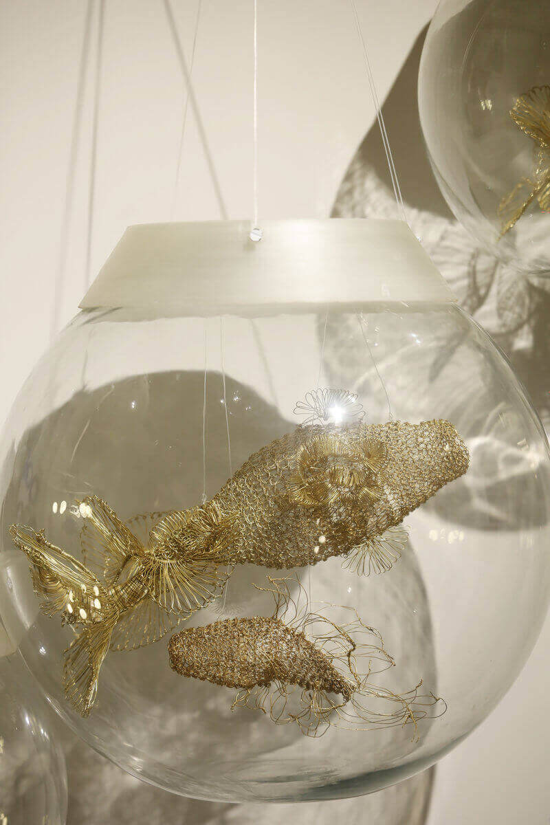 Composed of five distinct fish, each hand-crocheted in brass wire and housed within transparent spherical glass enclosures, the installation explores life as both a contained and continuously unfolding phenomenon.