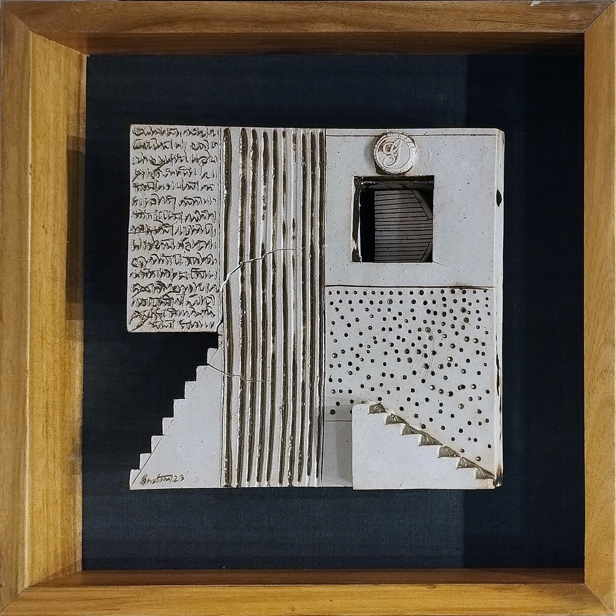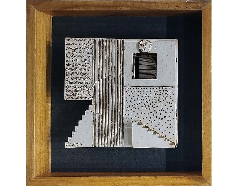 This sculpture presents a beautifully composed architectural abstraction that evokes a sense of structure, rhythm, and symbolism. Created in stoneware, it features geometric elements like staircases, windows, grids, and textured surfaces that harmoniously blend together to form a poetic visual language. The artist plays with texture and relief—using lines, perforations, and engraved script-like markings—to suggest layers of memory, history, and communication embedded within the walls of time. The muted tones and earthy finish lend the piece a timeless, meditative quality, while the interplay of light and shadow enhances its depth and dimensionality. The work seems to explore the relationship between built space and human emotion—how architecture can hold stories, silences, and traces of existence. Thoughtful and minimal, it reflects an inner dialogue between form and feeling, where every carved line whispers a quiet narrative of home, belonging, and contemplation.