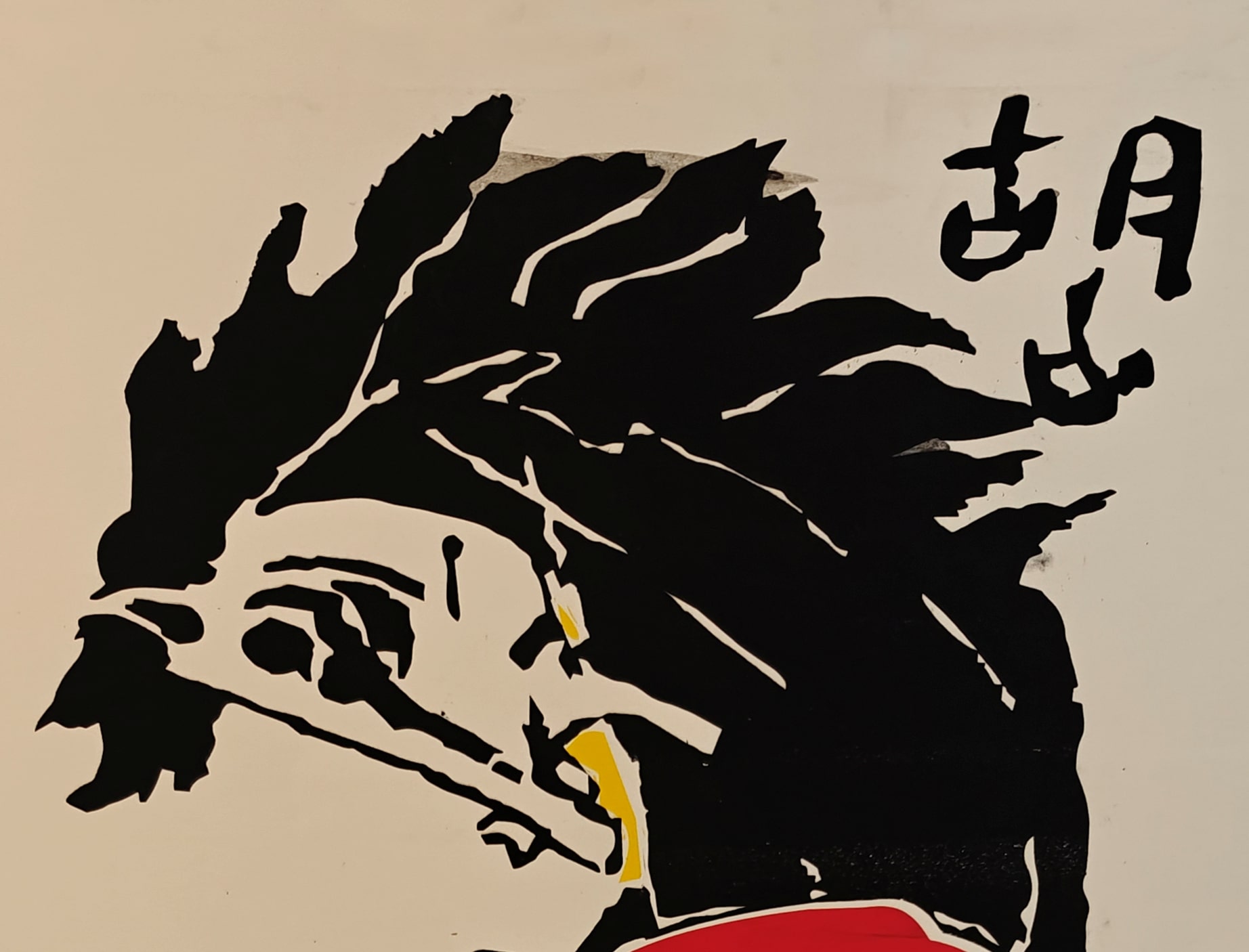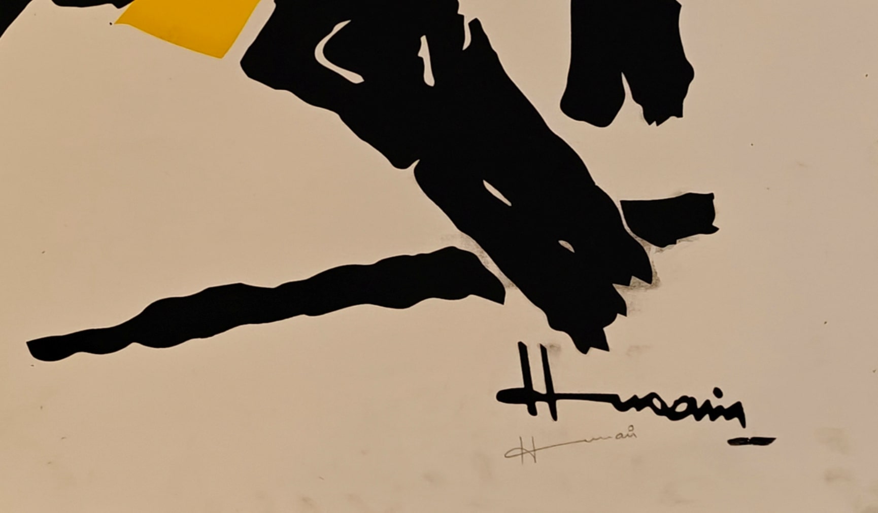 Rendered in striking black with accents of red and yellow, the horse appears mid-motion, its mane flaring wildly—exuding a fierce vitality. The abstracted form and minimalistic palette amplify the impact, while the use of flat planes of color and sharp contours reflects Husain’s deep engagement with both Indian visual traditions and modernist aesthetics.