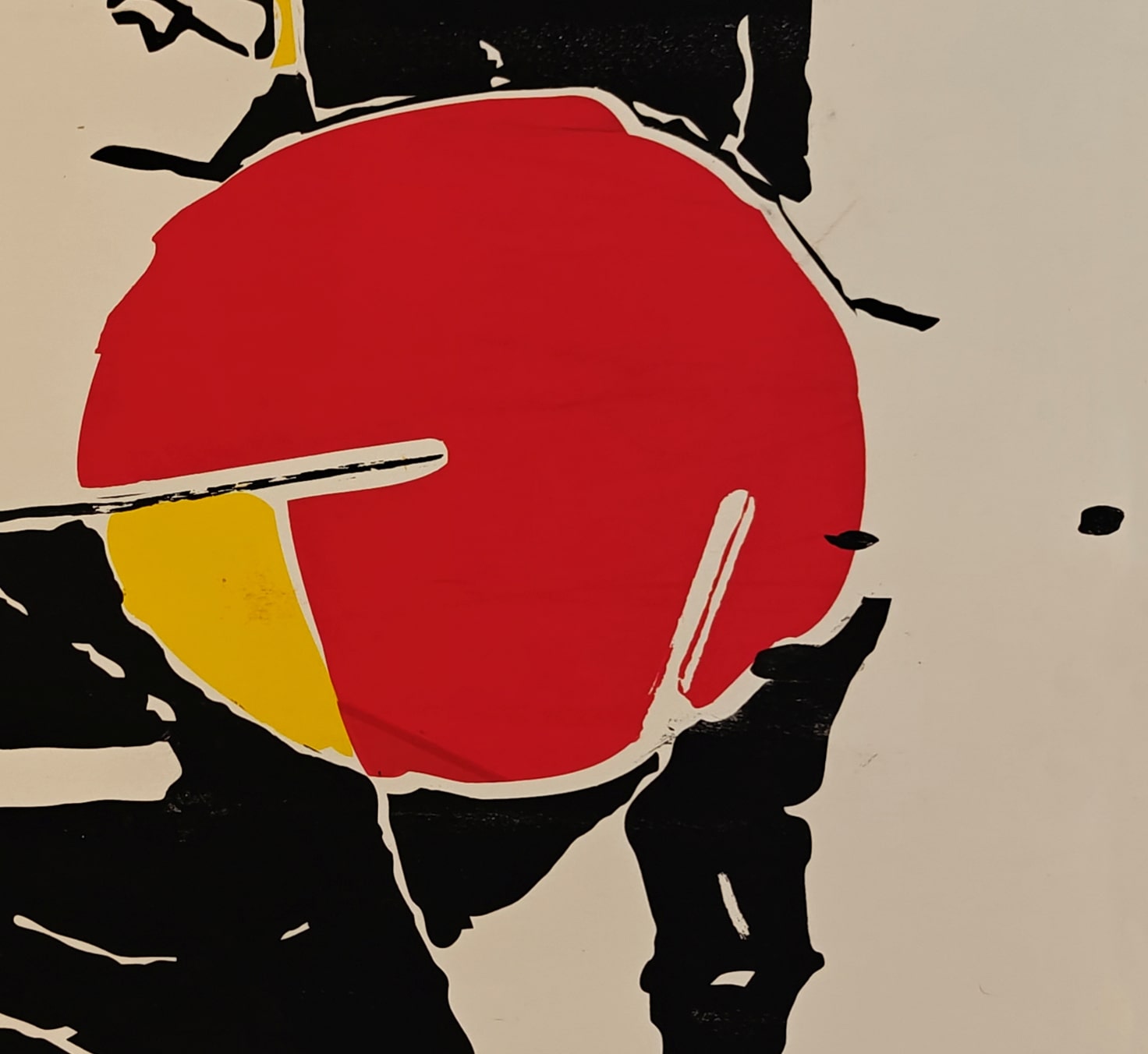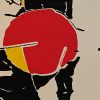 The large red circular element at the center, intersected with yellow, could be read as a rising sun or shield, infusing the piece with symbolism and visual tension. The calligraphic script at the top adds an additional layer of cultural resonance, possibly referencing an Eastern or Persian influence.