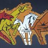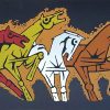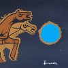 The stylized, angular forms outlined in thick black contours emphasize their power and motion, while the arrangement of the horses conveys rhythm and unity, as though they are galloping together toward a shared destiny. The circular blue form on the right adds a contrasting focal point, suggesting a celestial body, perhaps the sun or moon, symbolizing eternal cycles of life and nature.