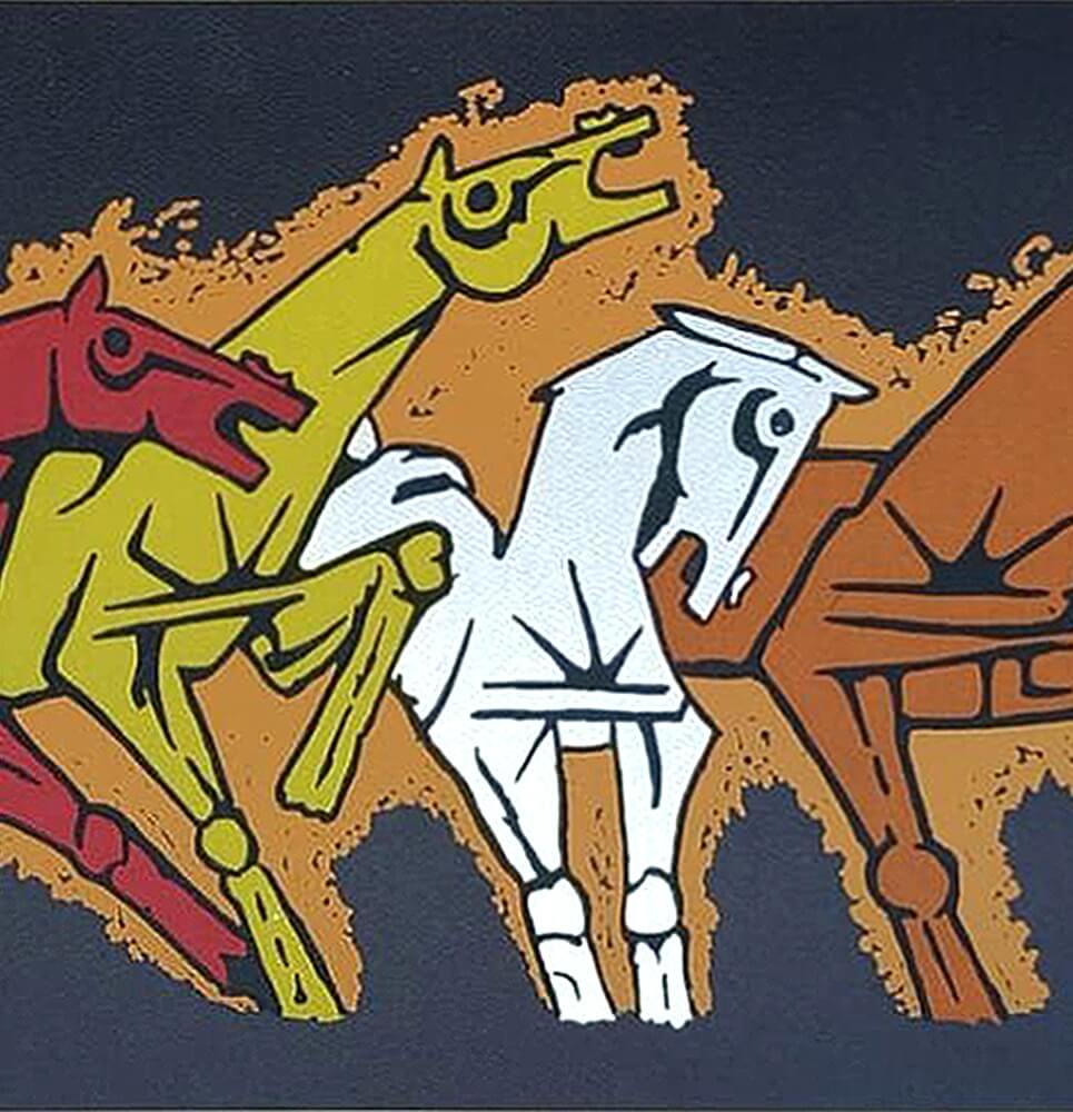 This striking artwork is by M.F. Husain, titled Horses (Serigraph on Paper, 39 x 19 inches). Known as the “Picasso of India,” Husain often used the motif of horses to symbolize strength, vitality, and unrestrained spirit. In this serigraph, the horses are depicted in bold, vibrant hues—red, blue, yellow, and earthy tones—charging forward with immense energy and dynamism.