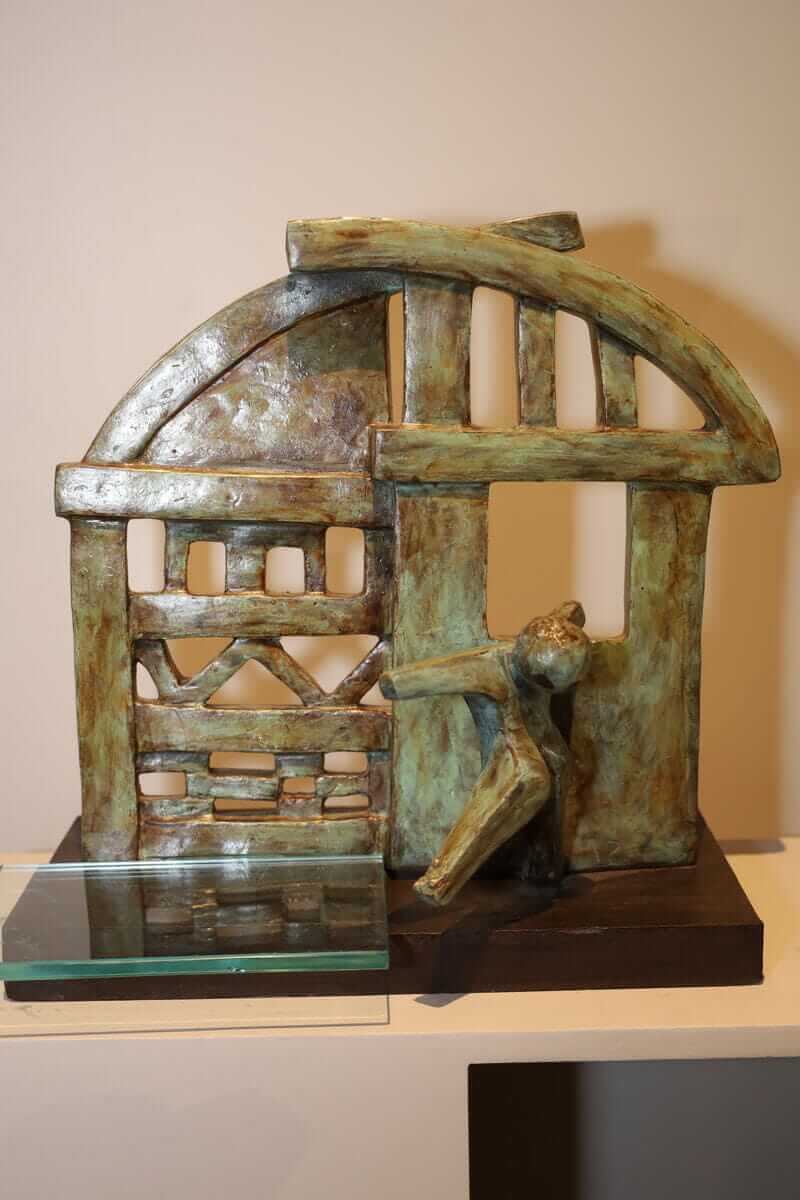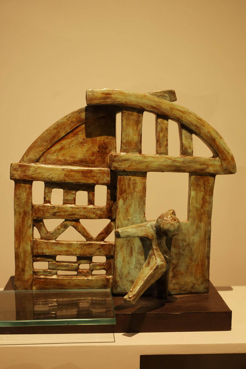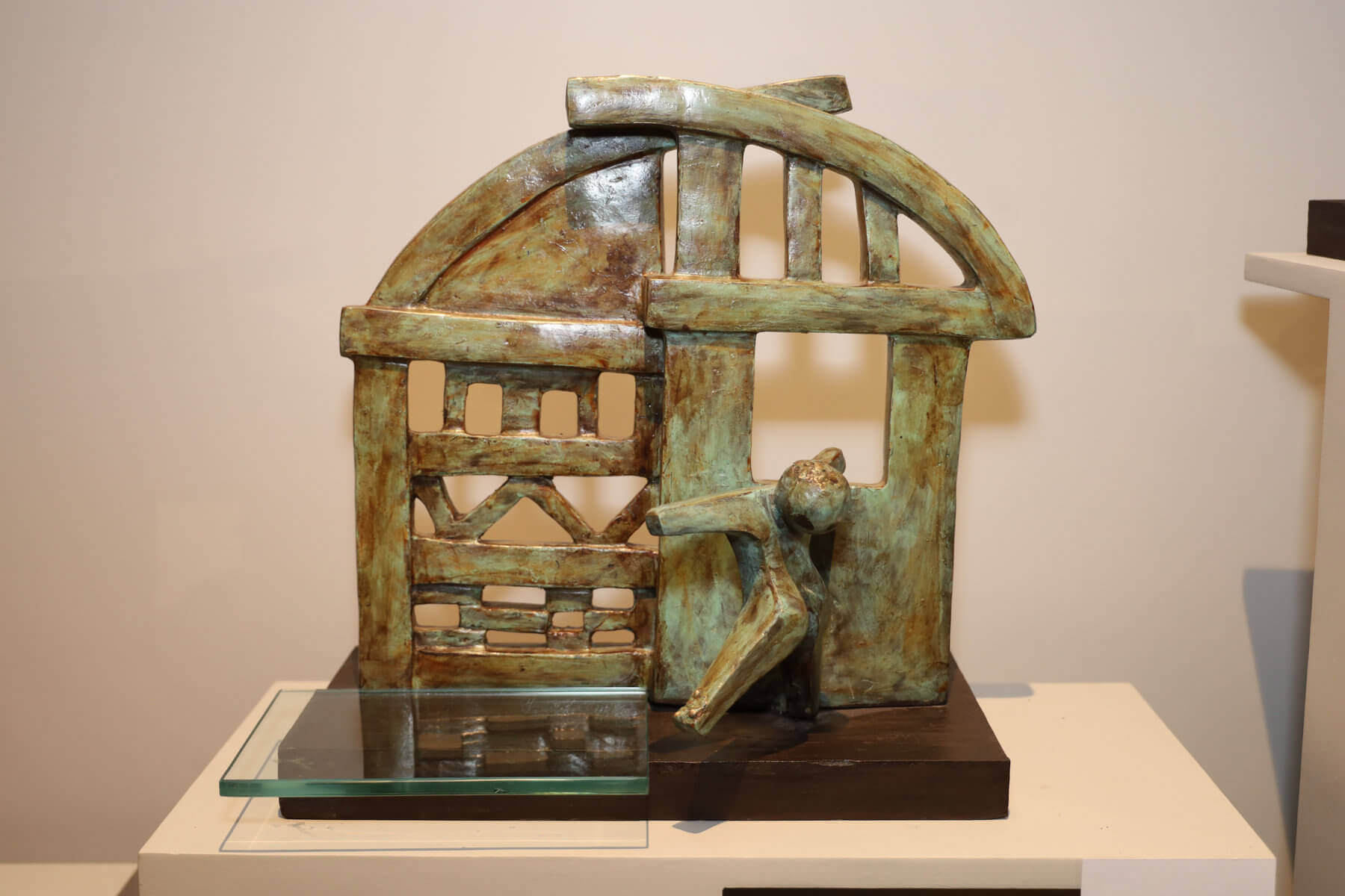 This evocative sculptural work presents a poetic interplay between structure and human emotion. Crafted in a house-like architectural form, the artwork symbolizes confinement and shelter simultaneously—its geometric openings, layered grids, and semi-circular roof suggesting both protection and restriction. Emerging from the facade is a simplified human figure, arms outstretched in a dynamic gesture, as if striving to break free from the confines of the built environment.