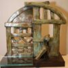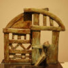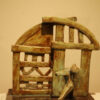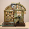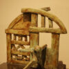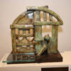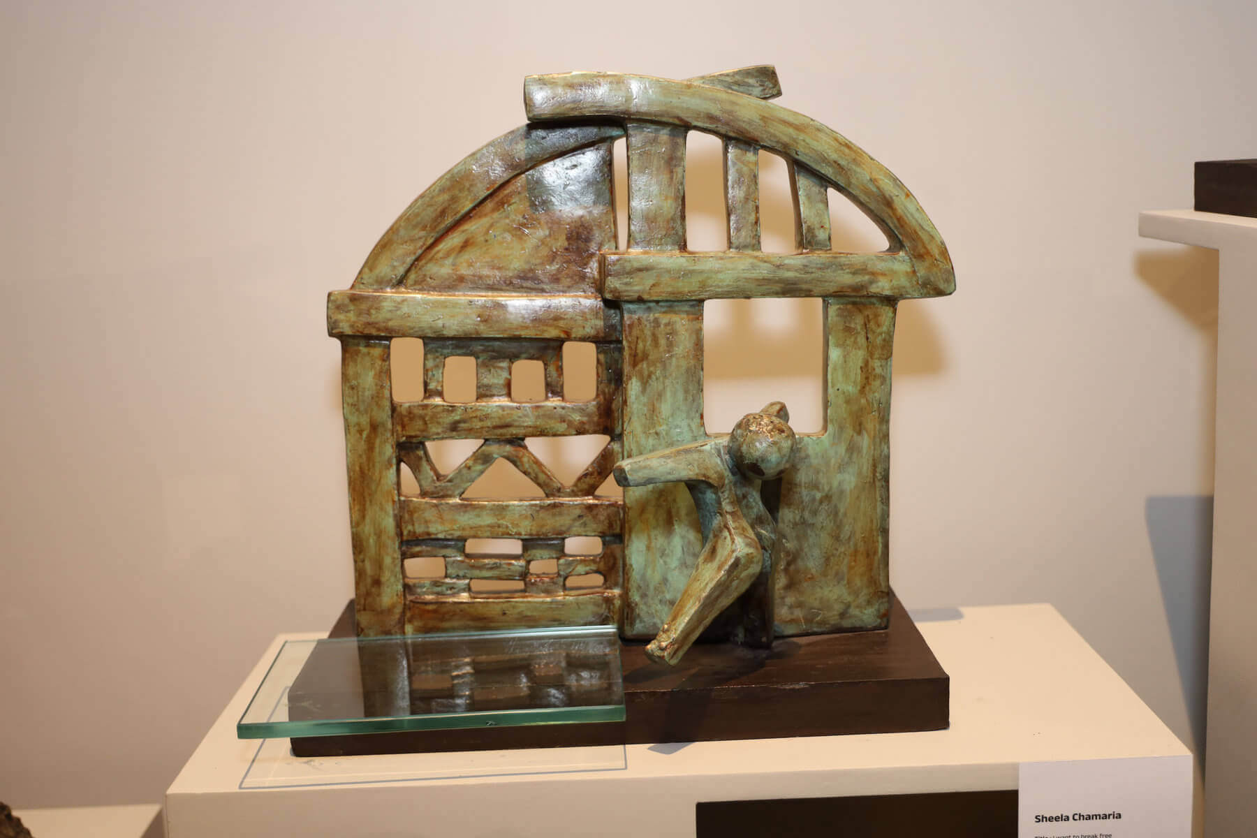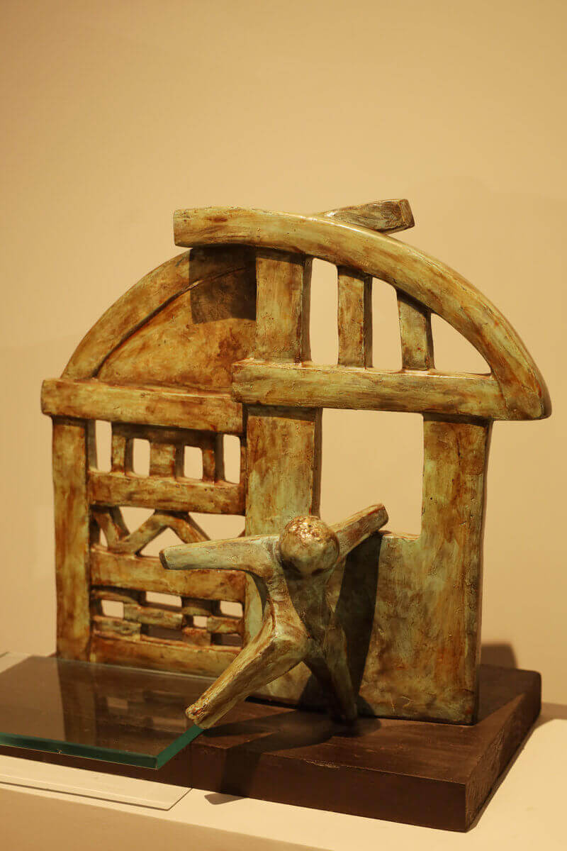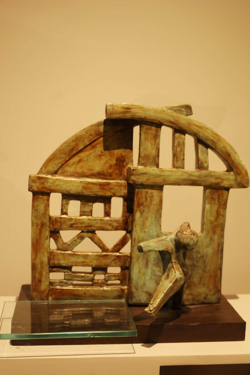 This evocative sculptural work presents a poetic interplay between structure and human emotion. Crafted in a house-like architectural form, the artwork symbolizes confinement and shelter simultaneously—its geometric openings, layered grids, and semi-circular roof suggesting both protection and restriction. Emerging from the facade is a simplified human figure, arms outstretched in a dynamic gesture, as if striving to break free from the confines of the built environment.