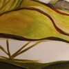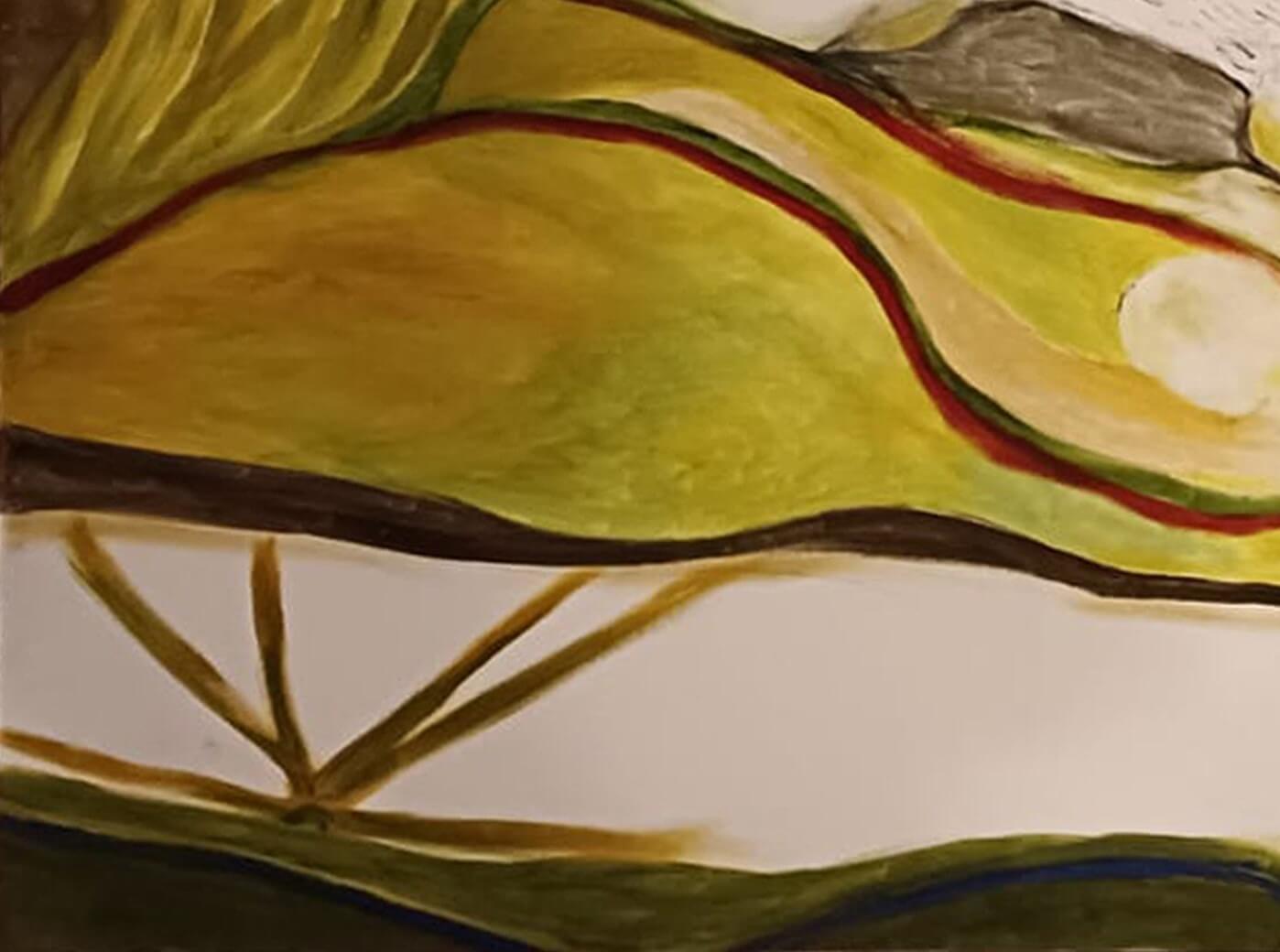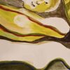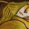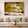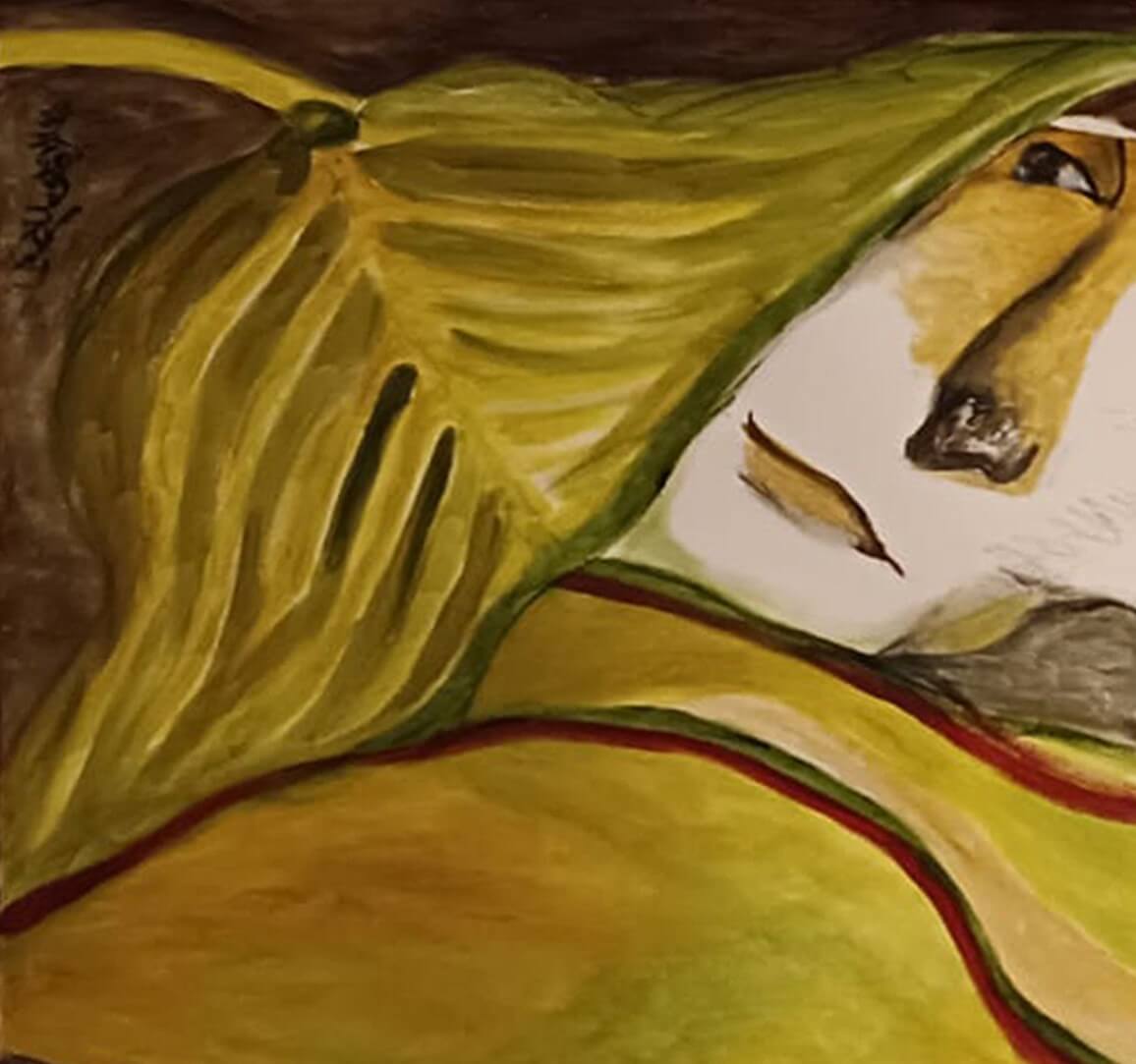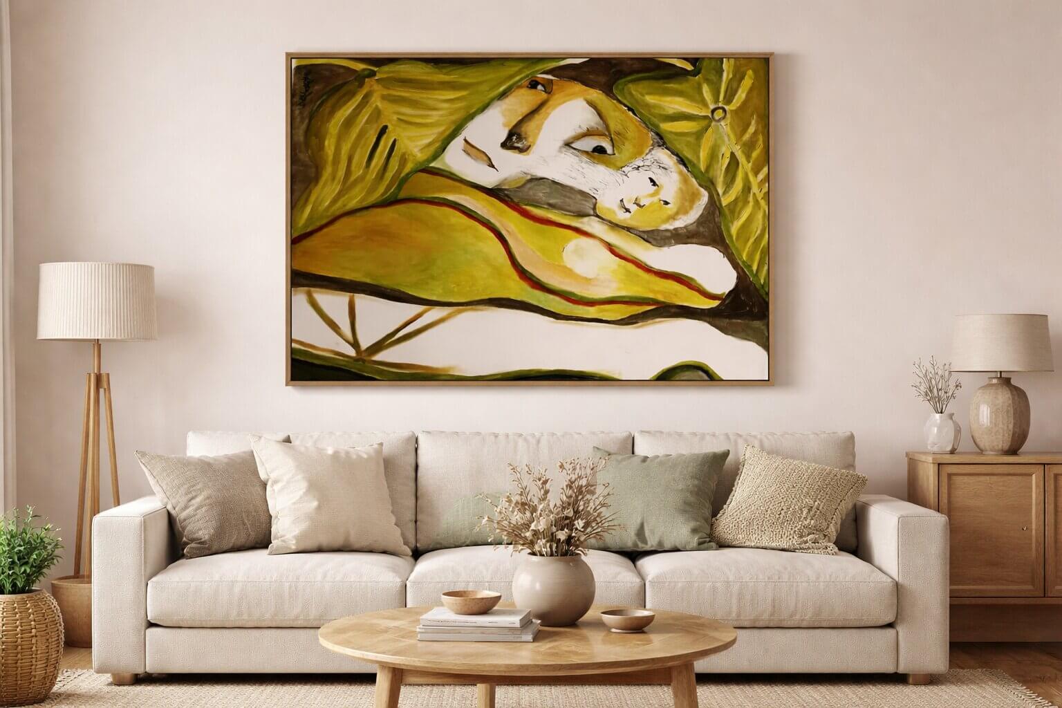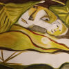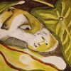 This evocative painting presents a surreal and intimate composition centered around a reclining female figure, partially enveloped by oversized, organic leaf forms. Rendered in a fluid, semi-abstract style, the figure’s face emerges softly from a landscape of undulating shapes and earthy tones. The artist employs a harmonious palette of greens, ochres, browns, and muted reds, creating a dreamlike atmosphere that blurs the boundaries between the human form and nature.