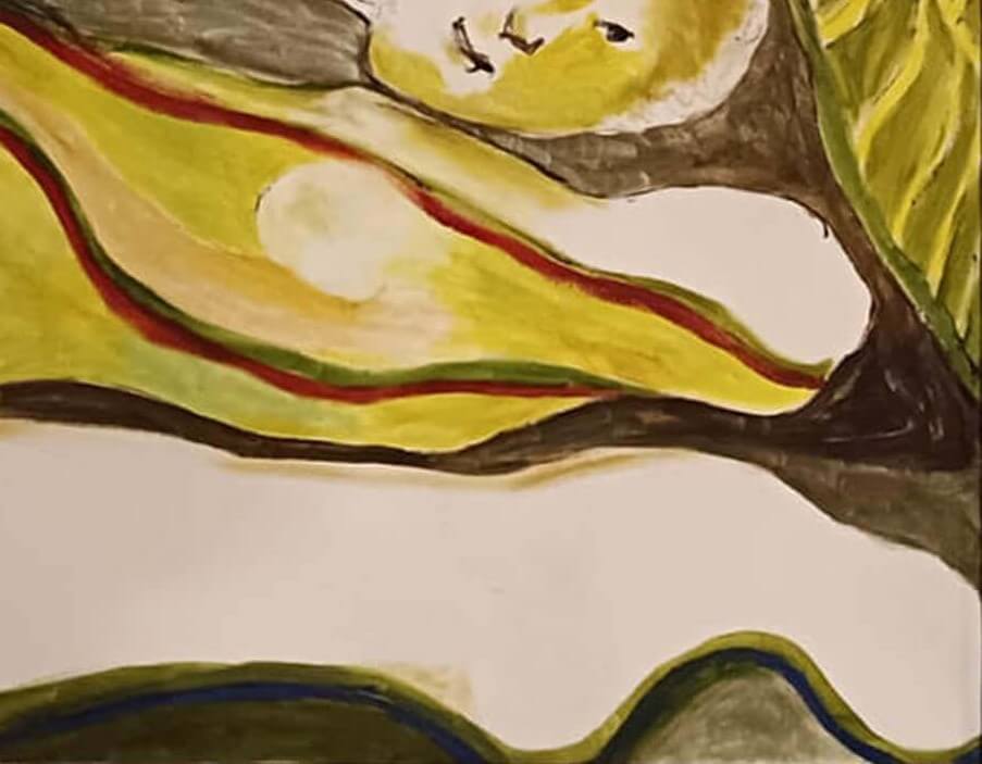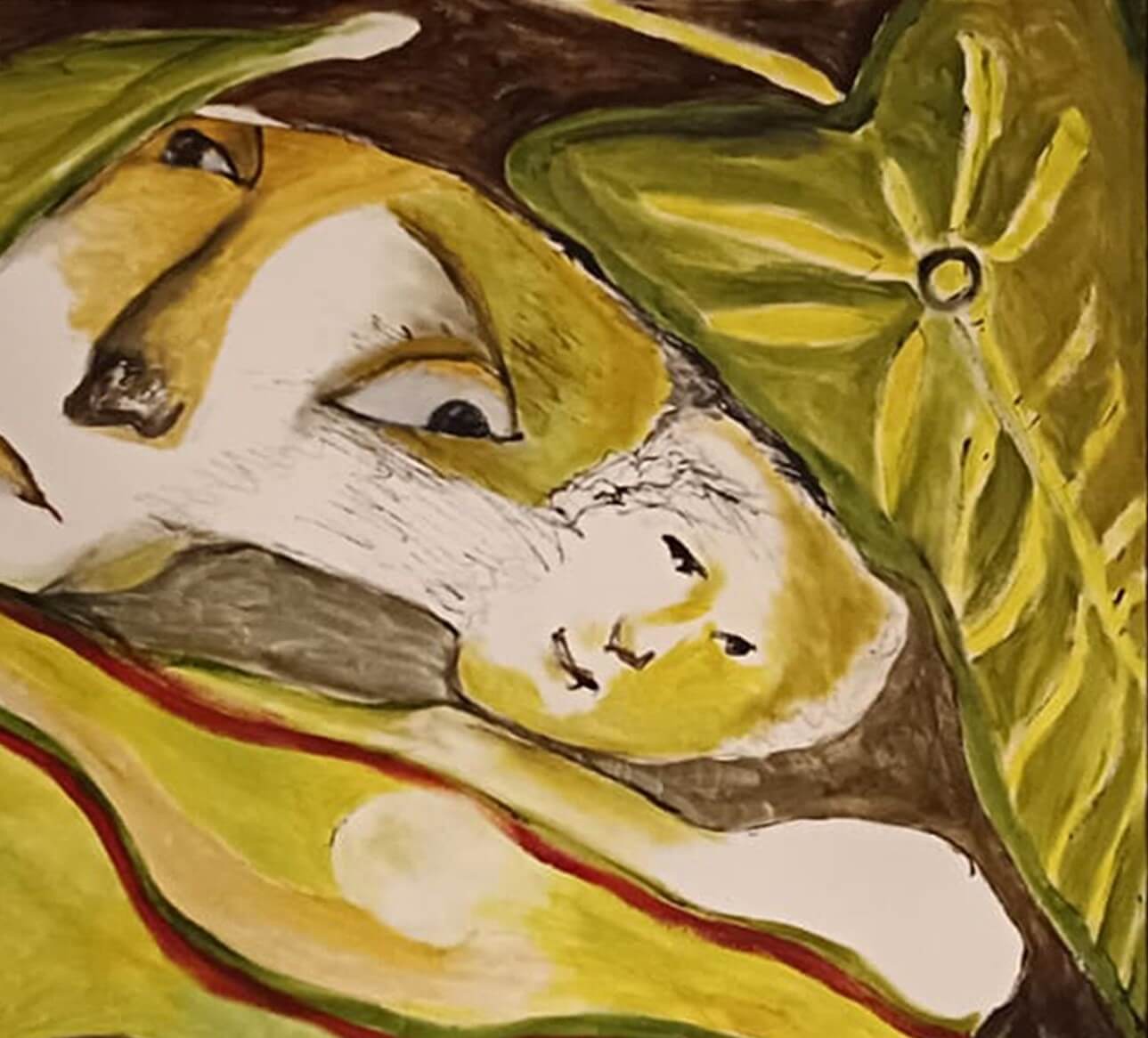 The elongated features, stylized contours, and gentle distortions lend the composition a poetic ambiguity—inviting viewers to interpret the narrative as one of introspection, concealment, or quiet sensuality. The layering of forms and rhythmic lines suggests both protection and entrapment, while the leaves act as symbolic elements—perhaps representing shelter, growth, or the subconscious mind.