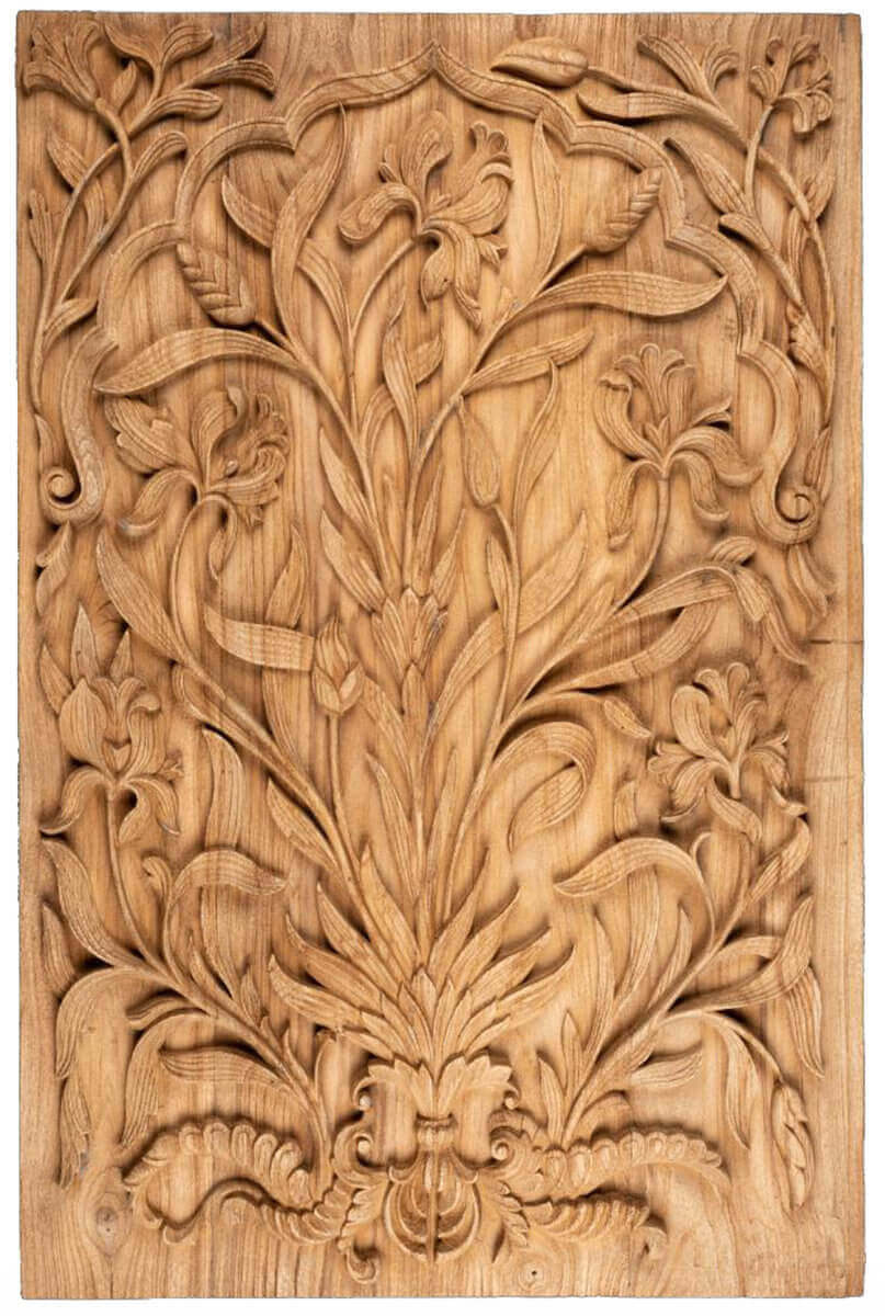 Executed in a warm, wood-toned finish, the piece highlights the natural grain and texture of the material, enhancing its tactile and visual richness. The harmonious blend of botanical motifs evokes a timeless aesthetic, reminiscent of classical decorative traditions while maintaining a refined contemporary appeal.