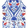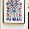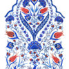 Delicate vines, blossoms, and elongated leaves flow gracefully from a central axis, creating a sense of balance and harmony. The intricate detailing is highlighted through a striking color palette of deep cobalt blue and rich red set against a crisp white background. The contrast of colors adds vibrancy while maintaining a sophisticated aesthetic, evoking influences of historic decorative arts and textile patterns.
