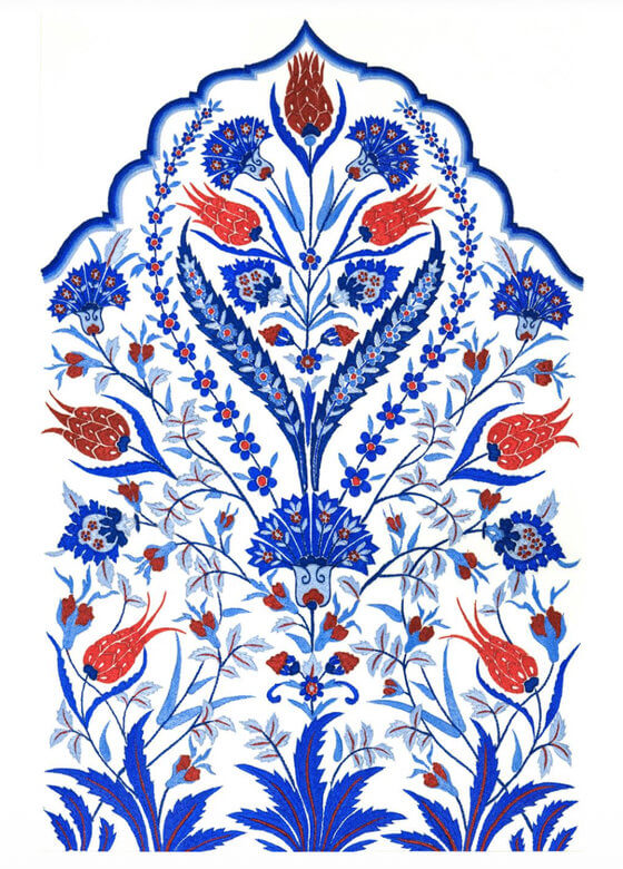 This elegant artwork draws inspiration from traditional ornamental design, featuring a beautifully symmetrical composition of stylized floral and botanical motifs. The arrangement is framed within an arched silhouette, reminiscent of classical architectural niches, enhancing its refined and timeless appeal.
