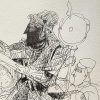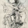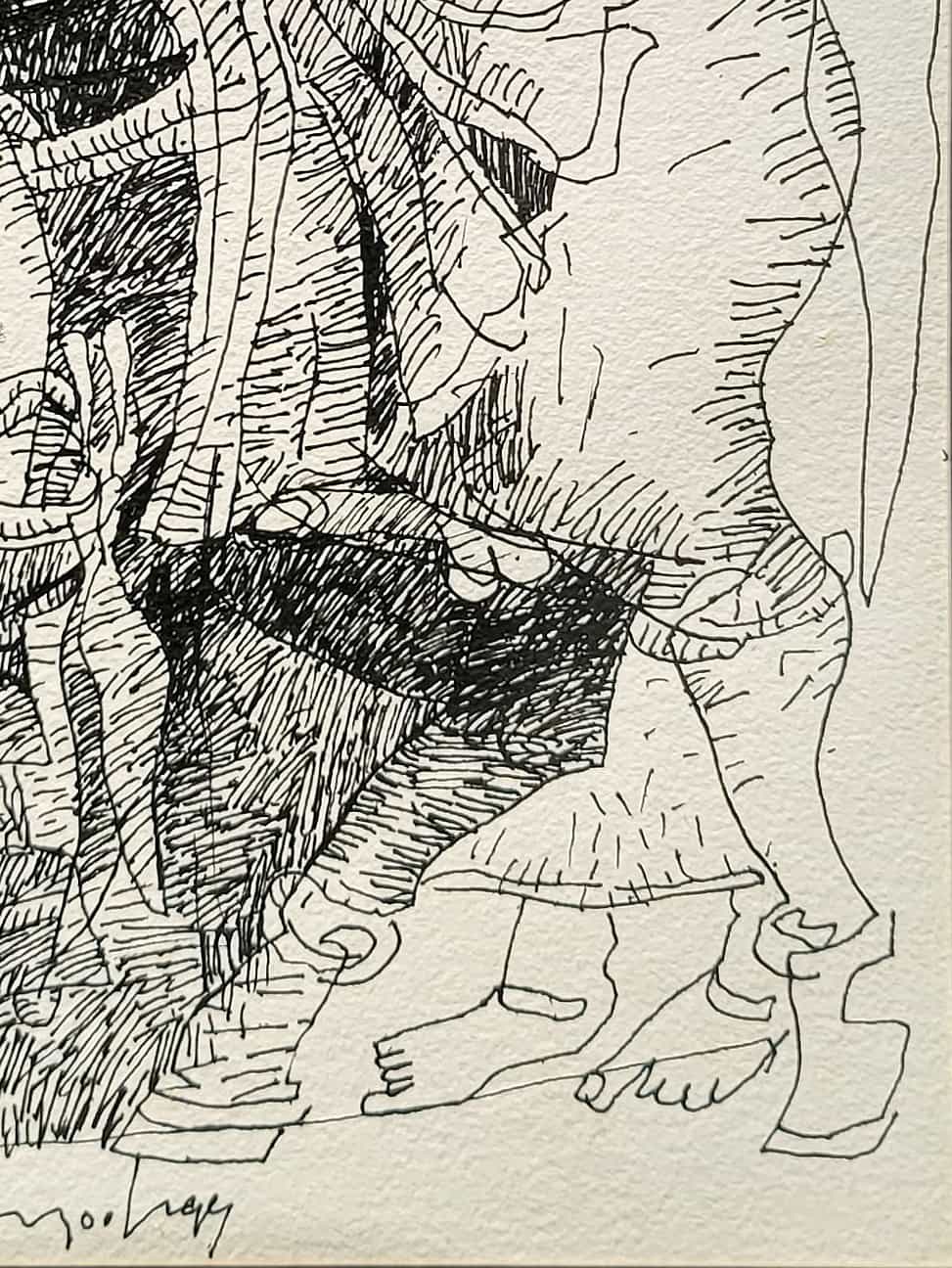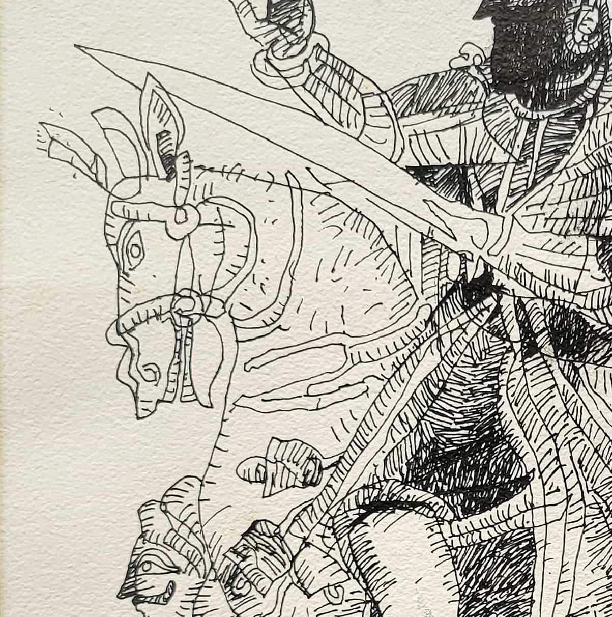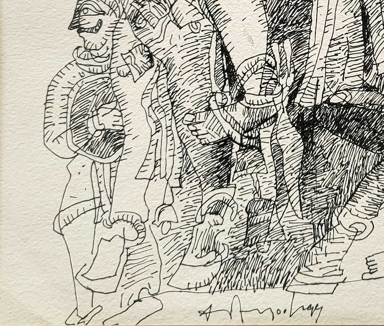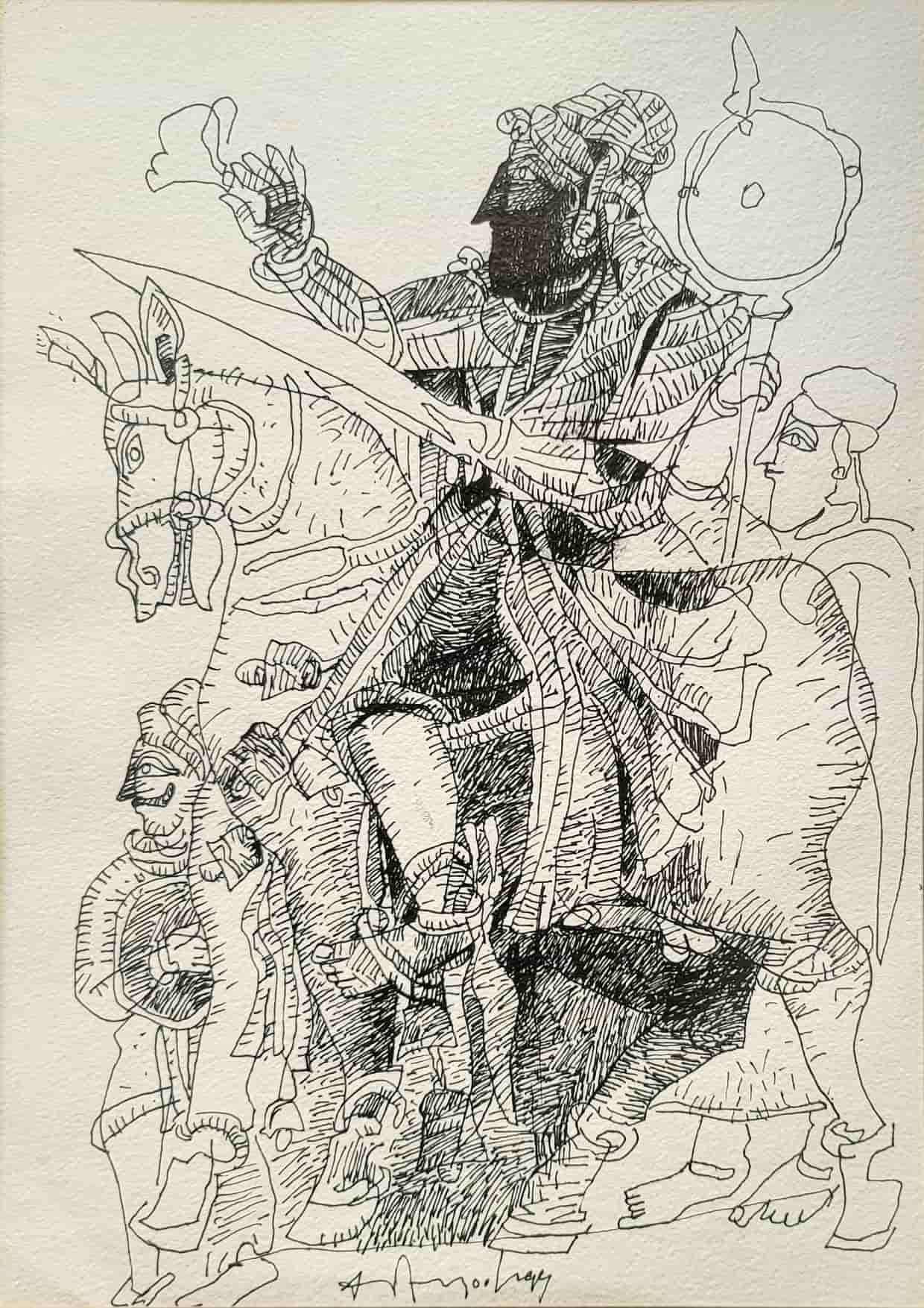 In this 1998 composition, Adimoolam presents a warrior figure on horseback, rendered with intricate lines and layered textures. The central figure appears regal and commanding, surrounded by attendants or soldiers, giving the scene a narrative of leadership and valor. The use of crosshatching and bold ink contrasts adds depth and movement, while the stylized forms recall ancient Indian murals and temple carvings, infusing tradition into a modernist vocabulary.