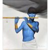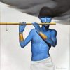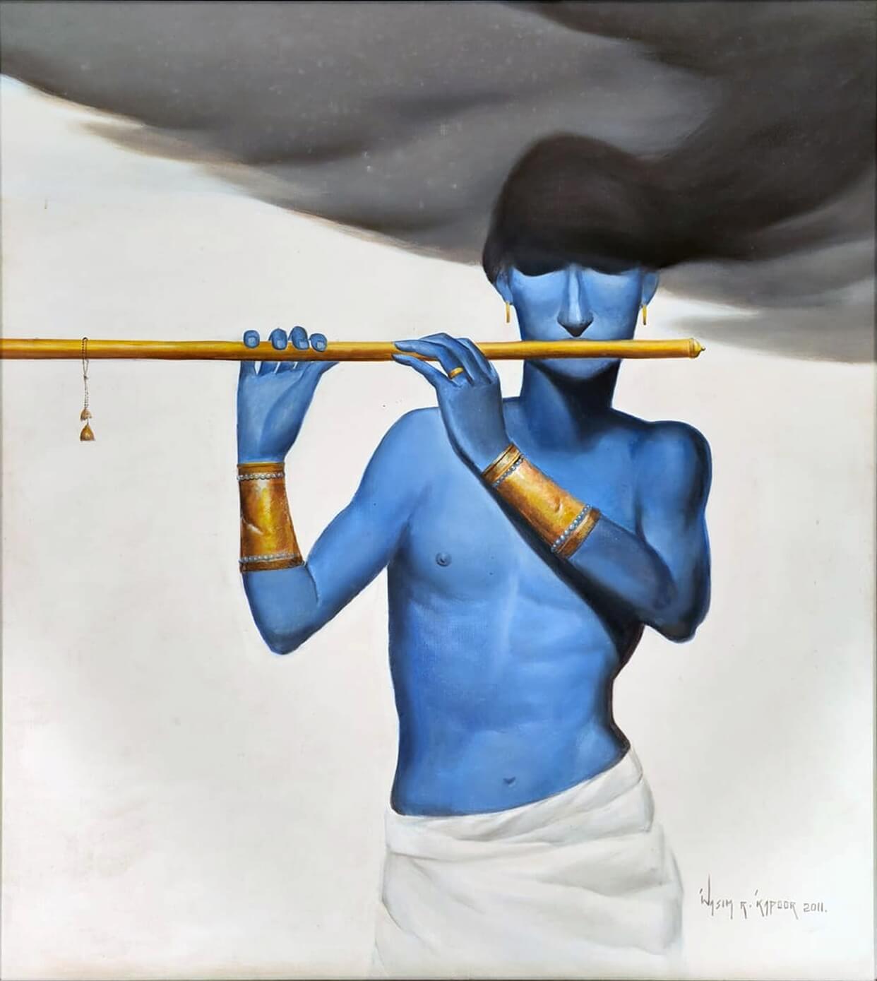 This painting by Wasim Kapoor (2011) presents a striking and poetic portrayal of Lord Krishna, rendered in his iconic blue form yet with a contemporary sensibility. The figure stands bare-chested, draped simply in white cloth, adorned with golden armlets and jewelry that highlight his divine aura. Krishna holds his flute gracefully, but instead of focusing on a traditional pastoral or mythological backdrop, Kapoor places him against a stark, almost surreal background.