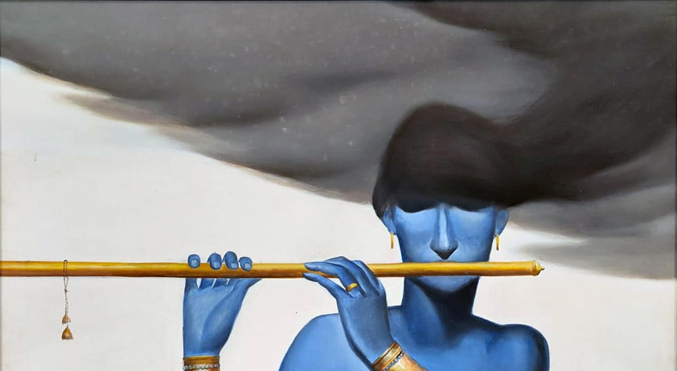 This painting by Wasim Kapoor (2011) presents a striking and poetic portrayal of Lord Krishna, rendered in his iconic blue form yet with a contemporary sensibility. The figure stands bare-chested, draped simply in white cloth, adorned with golden armlets and jewelry that highlight his divine aura. Krishna holds his flute gracefully, but instead of focusing on a traditional pastoral or mythological backdrop, Kapoor places him against a stark, almost surreal background. A dark, smoky cloud sweeps across the upper part of the canvas, blending seamlessly with Krishna’s flowing hair, evoking both mystery and a sense of transcendence. The work combines realism in its detailed treatment of the body with a dreamlike abstraction that elevates the mood. Kapoor’s Krishna is not just a mythological deity but also an eternal symbol of music, love, and spiritual longing. The painting captures the dual essence of Krishna — as a divine, otherworldly presence and as an intimate, human figure who resonates with deep emotional and cultural significance.