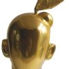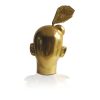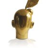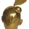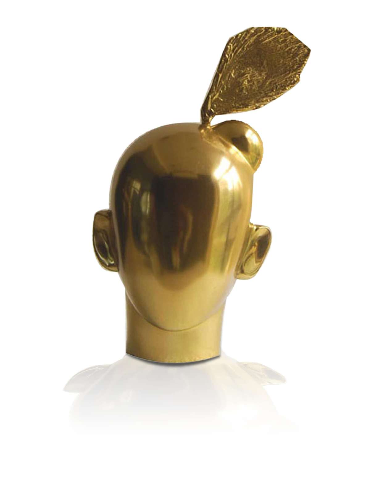 Krishna is a bronze sculpture with a sleek golden finish, featuring a minimalist head crowned with a stylized peacock feather. A modern yet deeply symbolic piece, it blends spiritual essence with contemporary sculptural elegance.