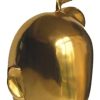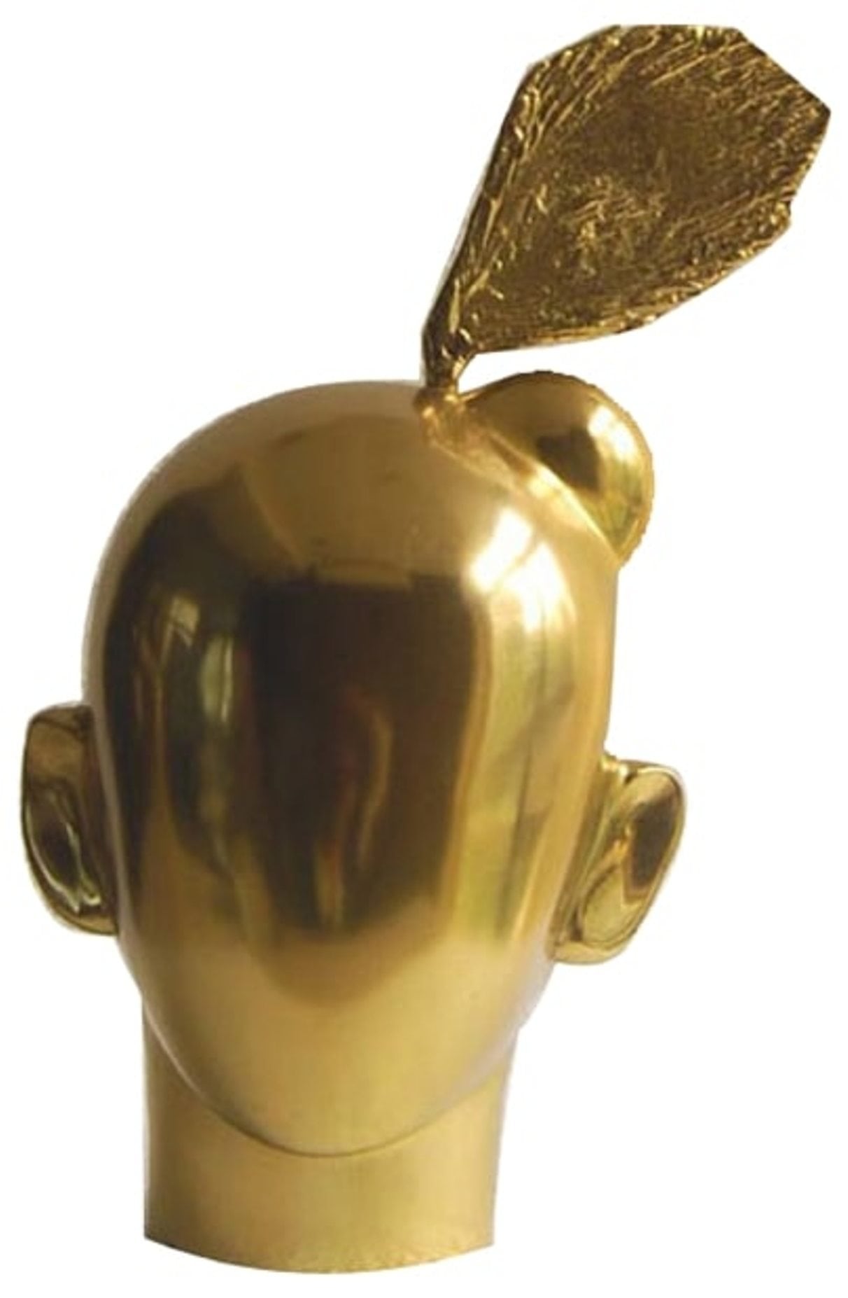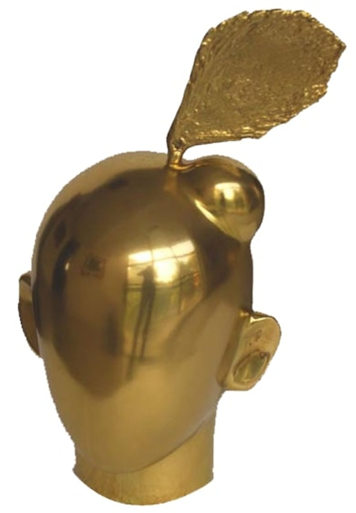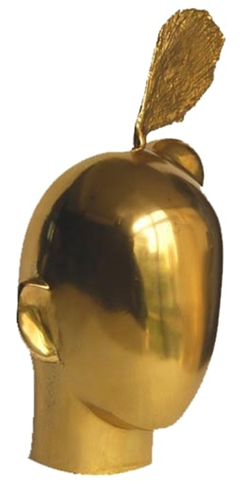 This bronze sculpture by K.S. Radhakrishnan, titled Krishna, presents a highly stylized and contemporary interpretation of the divine figure. Crafted in a lustrous golden finish, the work depicts the back of a smooth, minimalist head, crowned with a single textured leaf-like ornament that alludes to Krishna’s iconic peacock feather. The simplicity of form, devoid of facial features, draws focus to the symbolic element, allowing the piece to resonate with both modern design sensibilities and timeless spiritual associations. The polished surface reflects light beautifully, adding an aura of serenity and elegance to the work.
