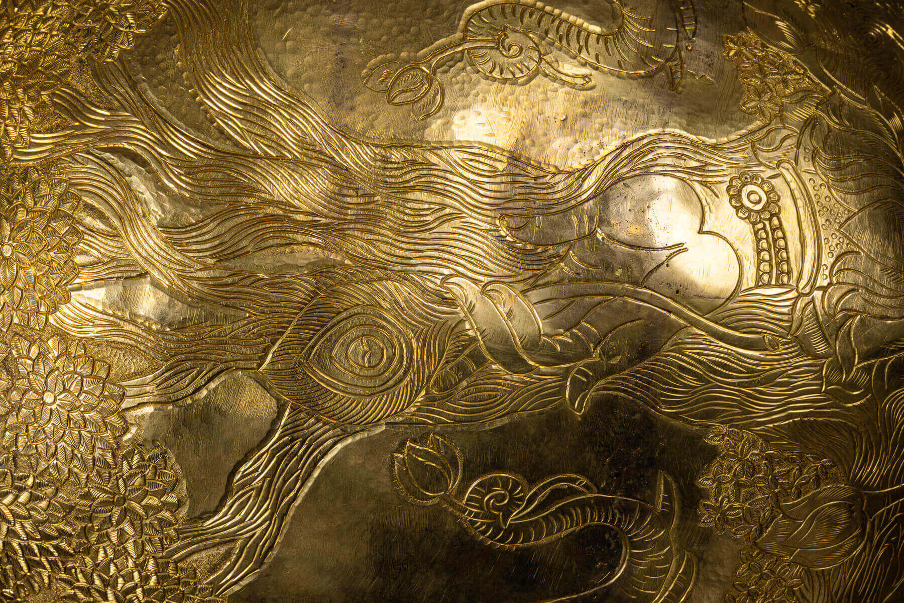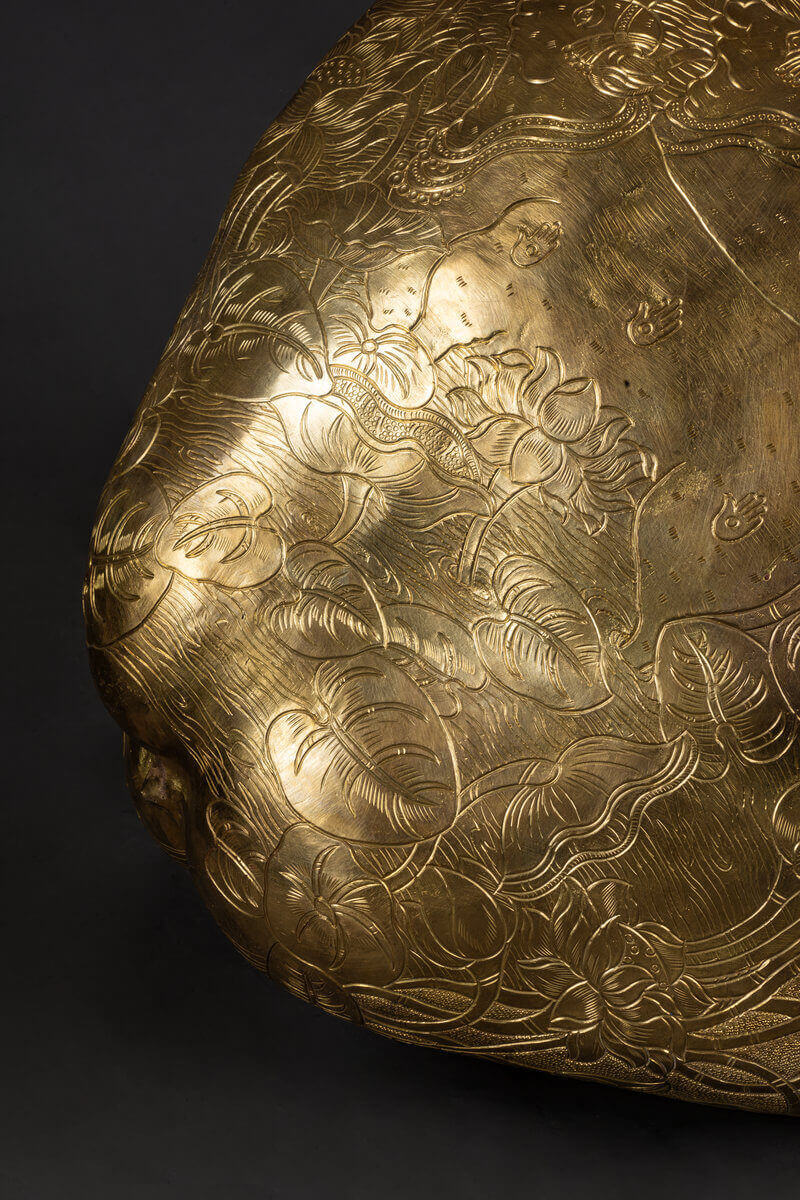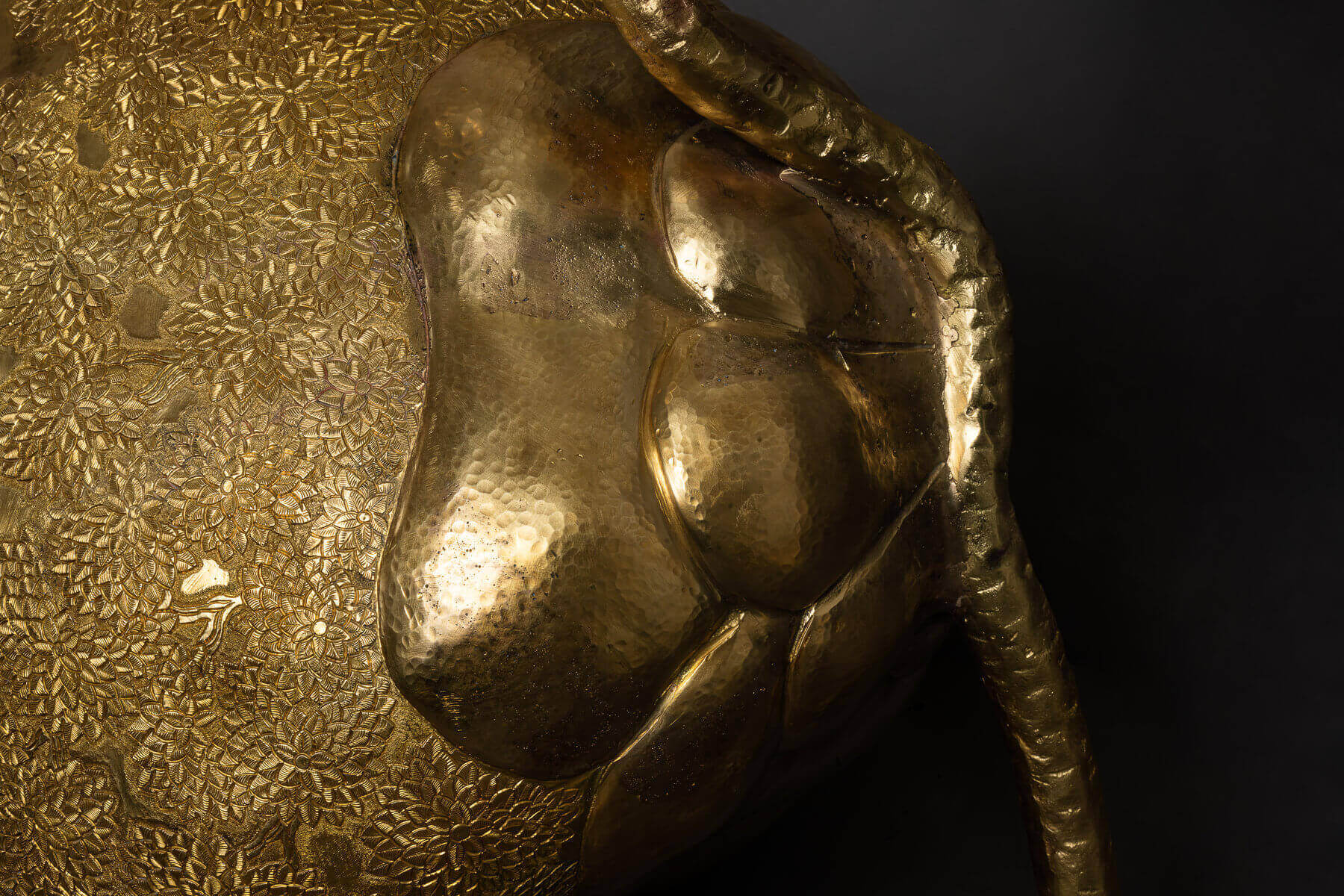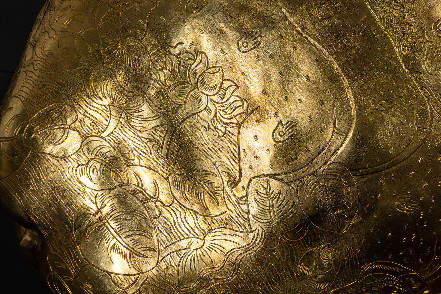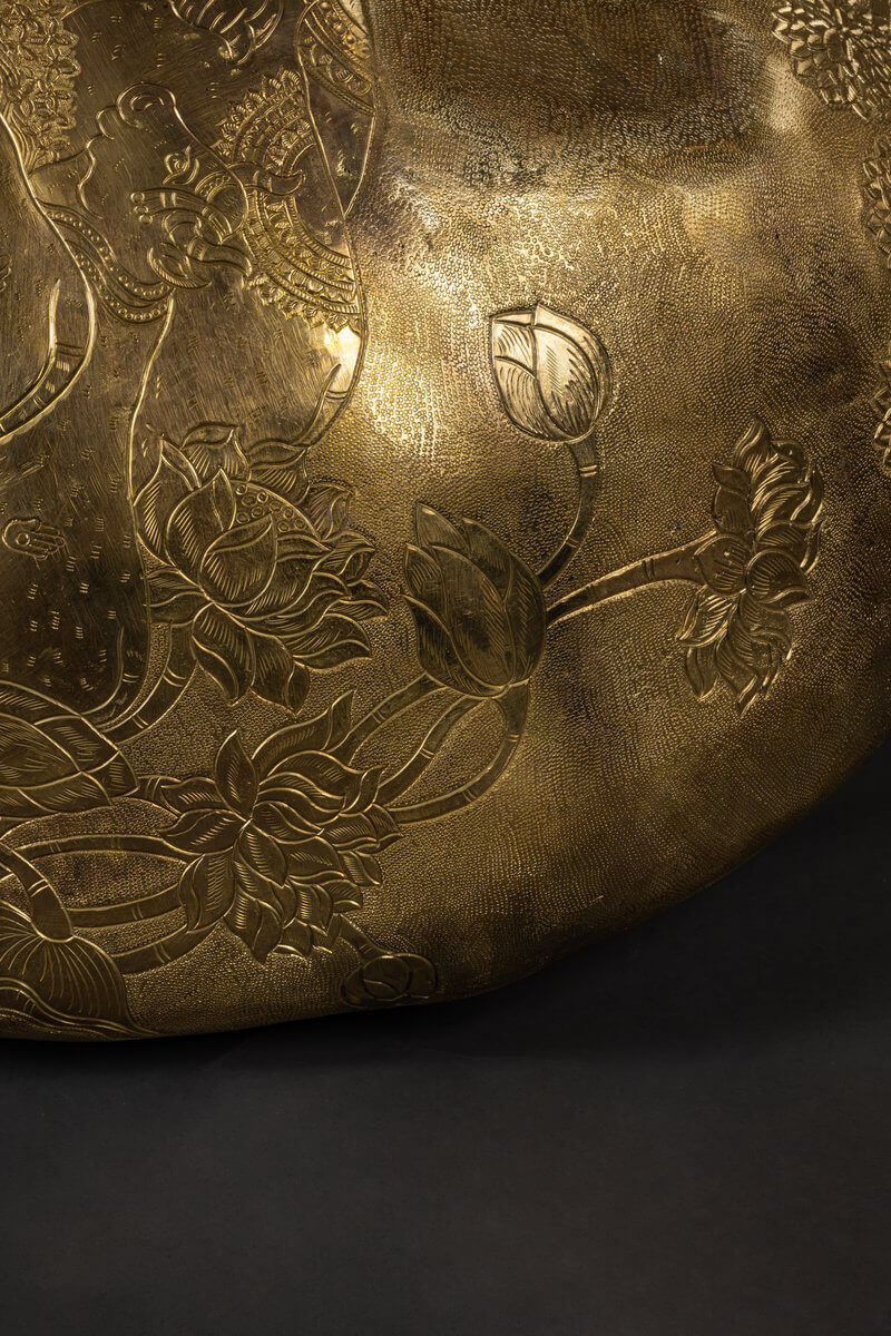 Deeper into the themes of memory, material, and tradition, reinterpreting the revered art of Pichwais through intricate sculptural forms. Drawing on his deep connection to nature and spirituality, he uses traditional Repoussé and Chasing techniques to translate textile-like fluidity into the permanence of brass. These works form a layered narrative that blends personal history with divine imagery, continuing a dialogue that has shaped his multidisciplinary practice. This new body of work mirrors the meditative attention of his earlier embroidery — where each stitch carried significance. Now, each engraved surface, each raised form in metal, becomes an extension of that same admiration and sensitivity.