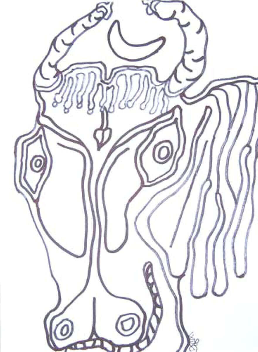Playful, symbolic, and deeply expressive, Laughing Cow by Prokash Karmakar (2006) transforms a familiar animal form into a powerful visual statement. Rendered in ink on paper, the composition is built with confident, flowing lines that give the cow an almost mythical presence. The crescent moon resting above its head and the ornamental detailing along the forehead introduce a subtle spiritual undertone, blending folk memory with modern expression.