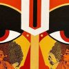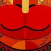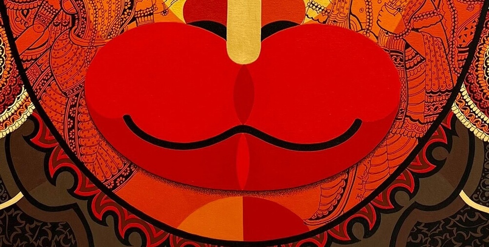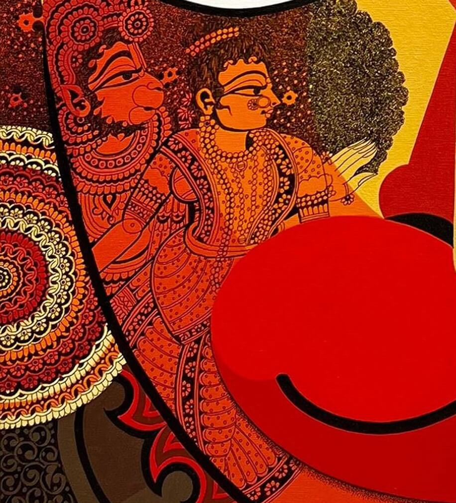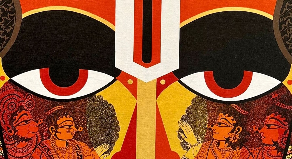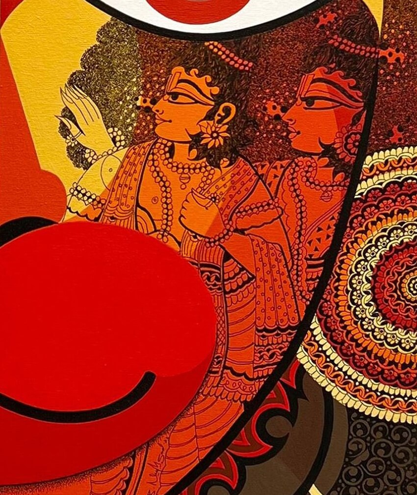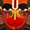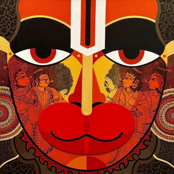 Dominated by a bold, symmetrical face of Hanuman rendered in vibrant reds, oranges, and blacks, the composition radiates power and devotion. The eyes are intensely expressive, drawing the viewer into the divine presence. Within the contours of Hanuman’s face, Goud intricately embeds miniature scenes from the Ramayana — depicting characters like Rama, Lakshmana, and Sita — creating layers of storytelling within a single visage.