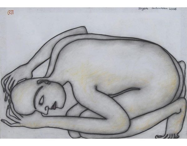 This evocative 2006 painting by Jogen Chowdhury, titled Man Kneeling on the Floor, is a deeply introspective work rendered in dry pastel on paper. The composition depicts a solitary nude figure curled into a fetal-like position, embodying a sense of vulnerability, introspection, and retreat into the self. Chowdhury’s use of soft tonal shades and delicate contour lines enhances the emotional depth of the image, while the subdued palette emphasizes the quiet tension within the figure’s form. The elongated limbs and the tightly folded posture create a sculptural rhythm, evoking both confinement and protection. The face, calm yet withdrawn, suggests meditation or emotional exhaustion, making the artwork a poignant reflection on human fragility and inner turmoil. In this piece, Chowdhury masterfully combines anatomical precision with psychological nuance, transforming a simple pose into a powerful statement on the human condition.
