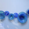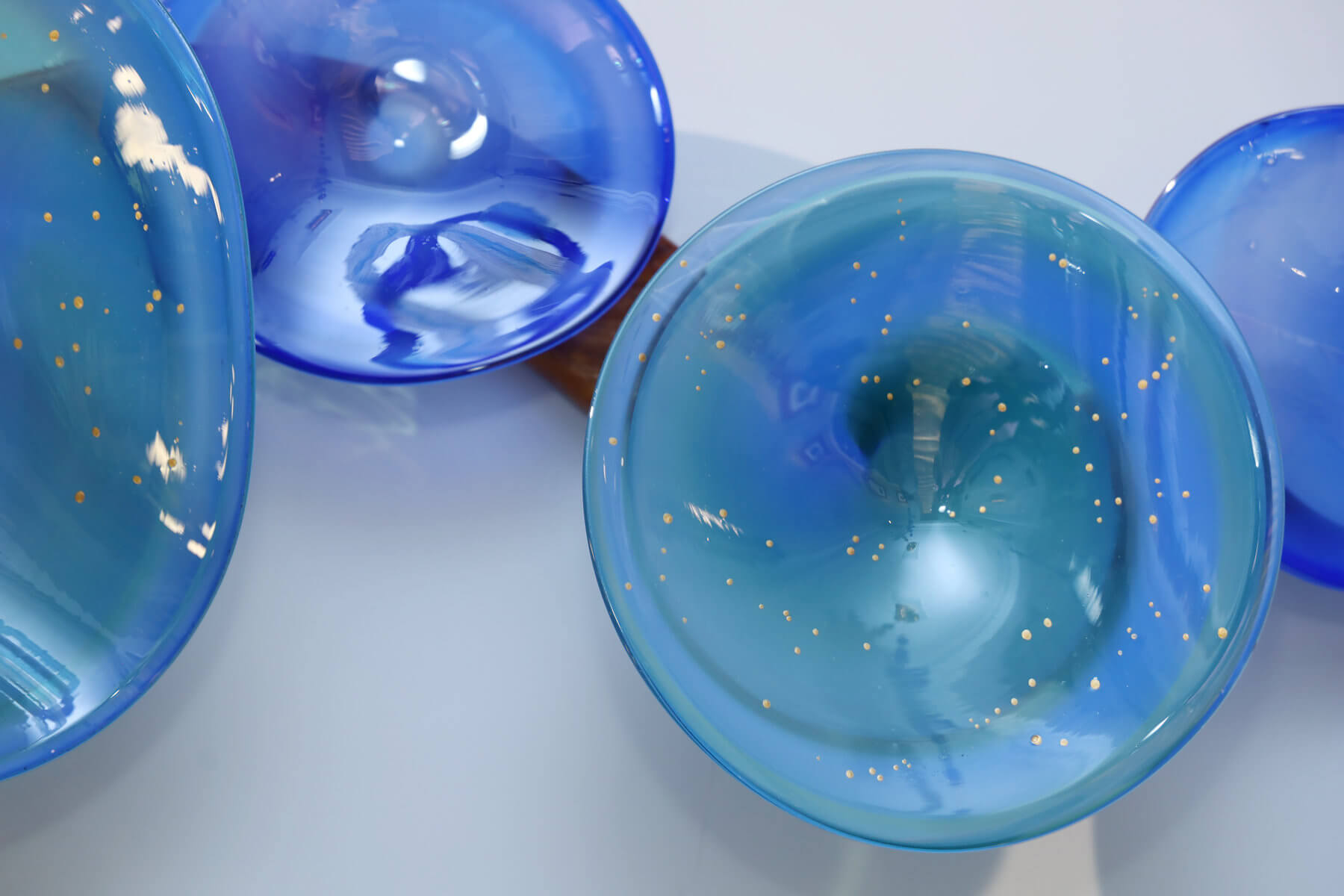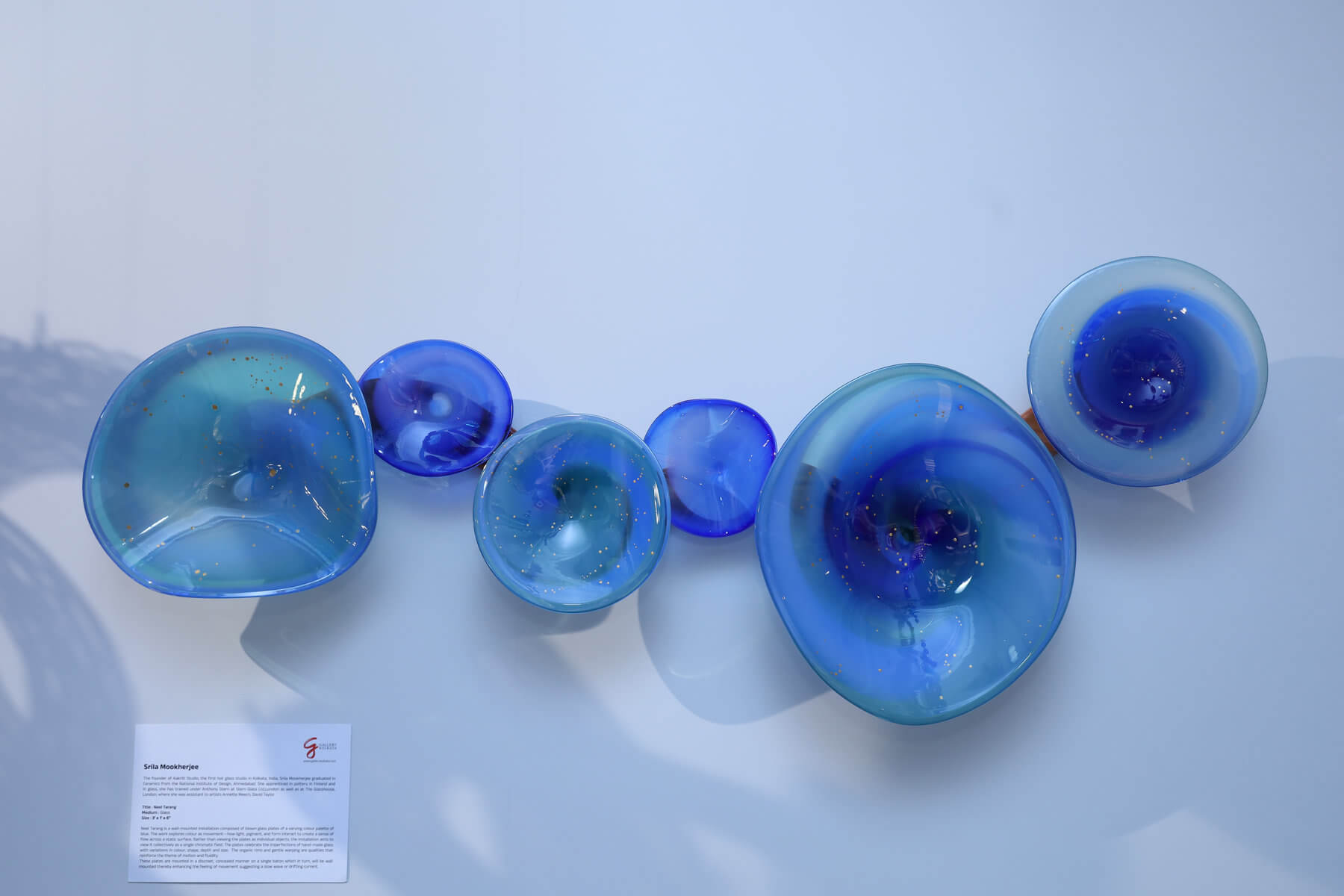 Neel Tarang is a wall-mounted installation composed of blown glass plates of a varying colour palette of blue. The work explores colour as movement — how light, pigment, and form interact to create a sense of flow across a static surface. Rather than viewing the plates as individual objects, the installation aims to view it collectively as a single chromatic field. The plates celebrate the imperfections of hand-made glass with variations in colour, shape, depth and size. The organic rims and gentle warping are qualities that reinforce the theme of motion and fluidity. These plates are mounted in a discreet, concealed manner on a single baton which in turn, will be wall mounted thereby enhancing the feeling of movement suggesting a slow wave or drifting current.