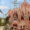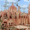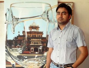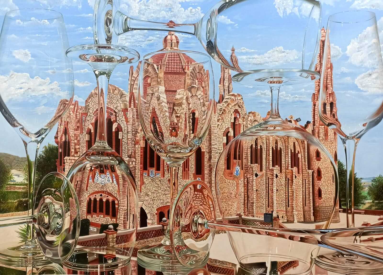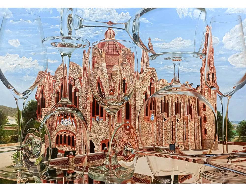 This painting is a striking example of hyperrealism, where meticulous detail and visual precision create an almost photographic illusion. The artist presents an intricate architectural structure, possibly inspired by European or Moorish design, with its ornate arches, domes, and textured brickwork. What makes the composition extraordinary is the presence of multiple wine glasses in the foreground — each glass capturing and distorting the building’s reflection in a mesmerizing play of light, refraction, and symmetry. The transparent surfaces magnify and twist the architectural forms, creating a rhythmic dance between clarity and distortion. Set against a bright blue sky dotted with soft clouds, the warm tones of the structure contrast beautifully with the cool transparency of the glass. The painting celebrates perception and craftsmanship, turning a simple still life into a sophisticated exploration of perspective, realism, and the beauty found in optical illusion.