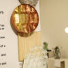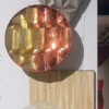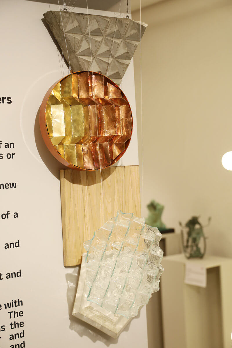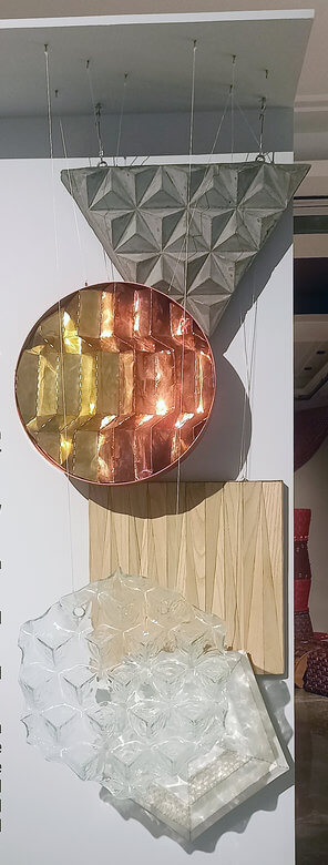 Pancha-Tattva | 5 Panels hanging – Glass, Concrete, Wood Veneer, Dupion Silk Textile, Brass and Copper | 1 ft dia each ; Overall size variable as per hanging