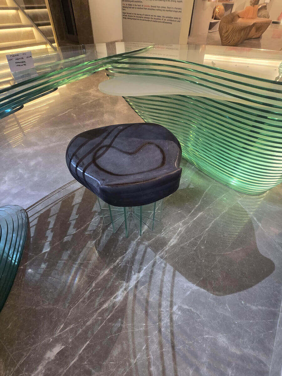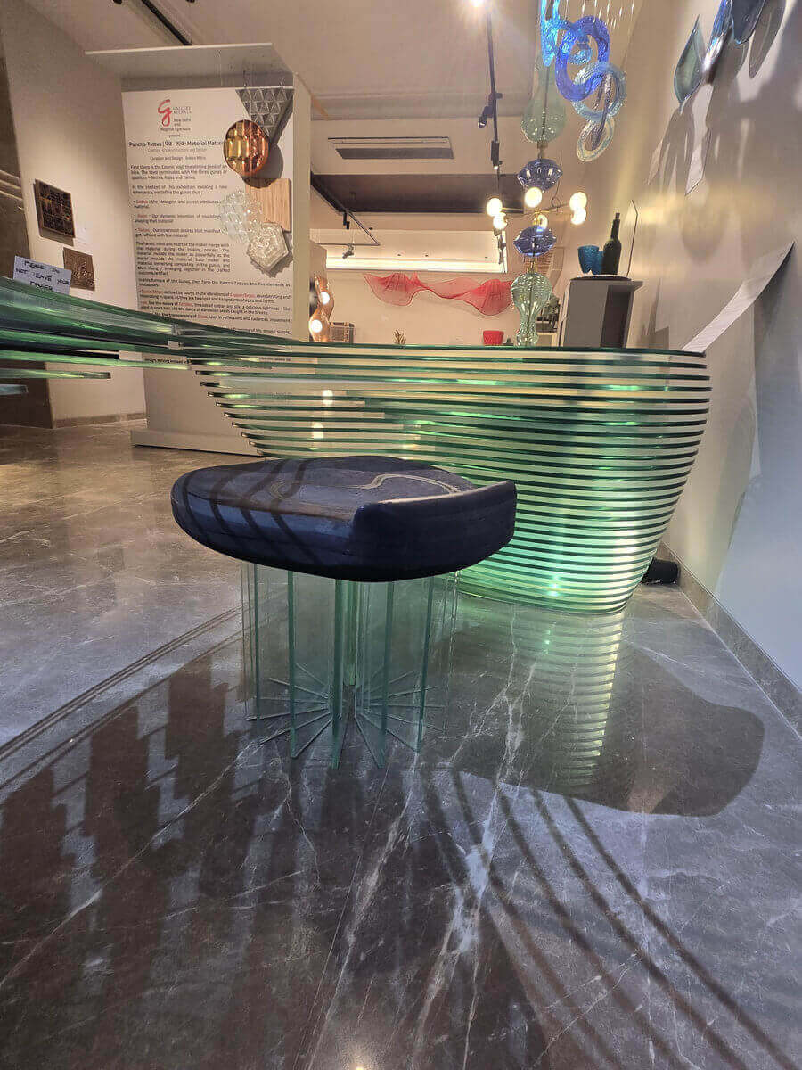 Ignis (Seat) is an array of 16 glass pieces supporting a wooden asan, finished and preserved through fire. The asan invites anyone to use the entire setup for creation. Rather than merely representing the five elements, Panchakriti stages their interdependence. Solidity meets translucency; mass converses with void; repetition produces breath. The table becomes more than furniture — it is a constructed equilibrium, a disciplined convergence of matter and interval.