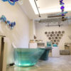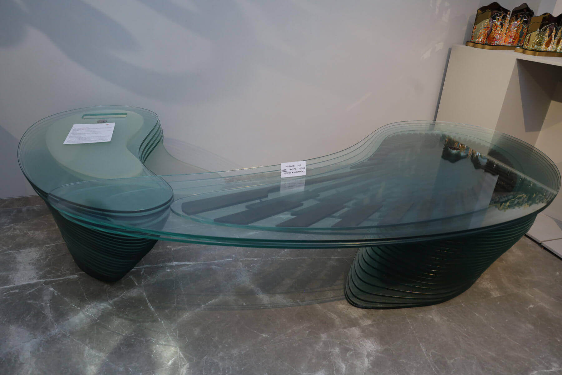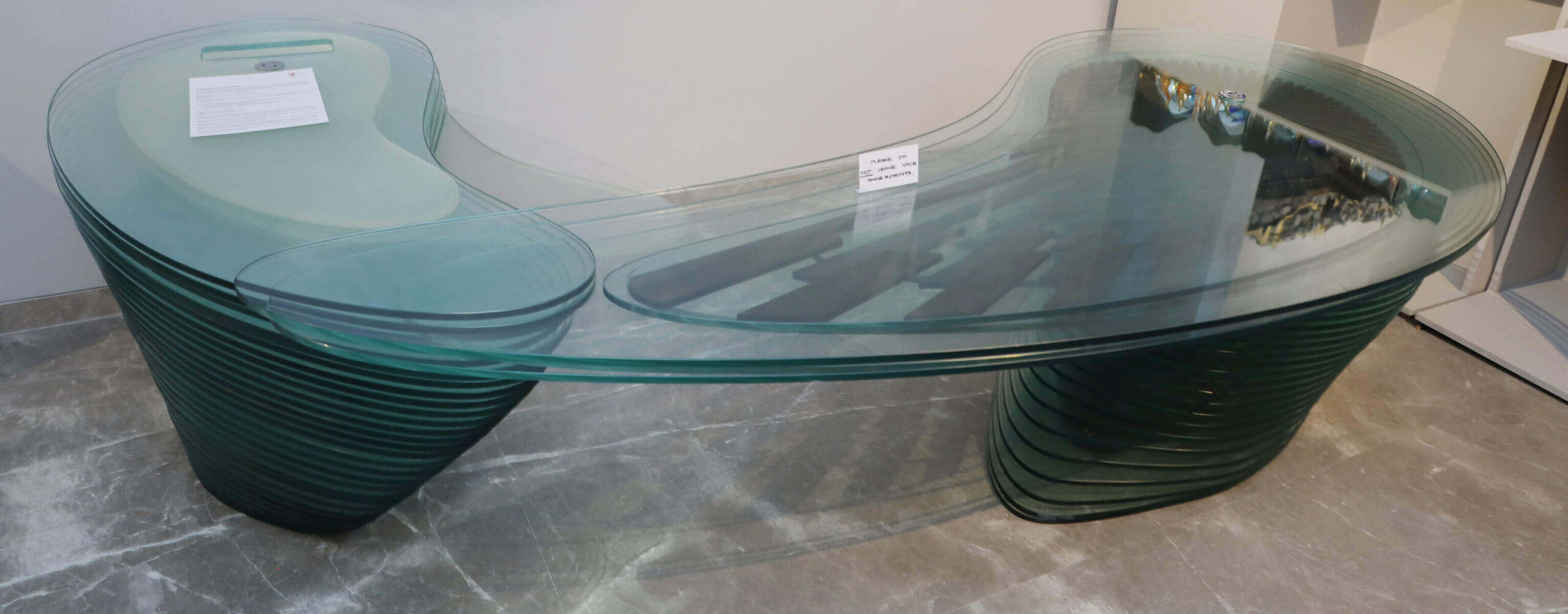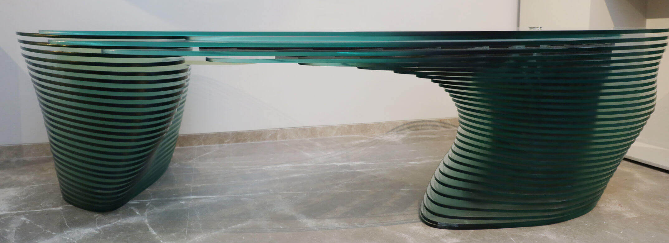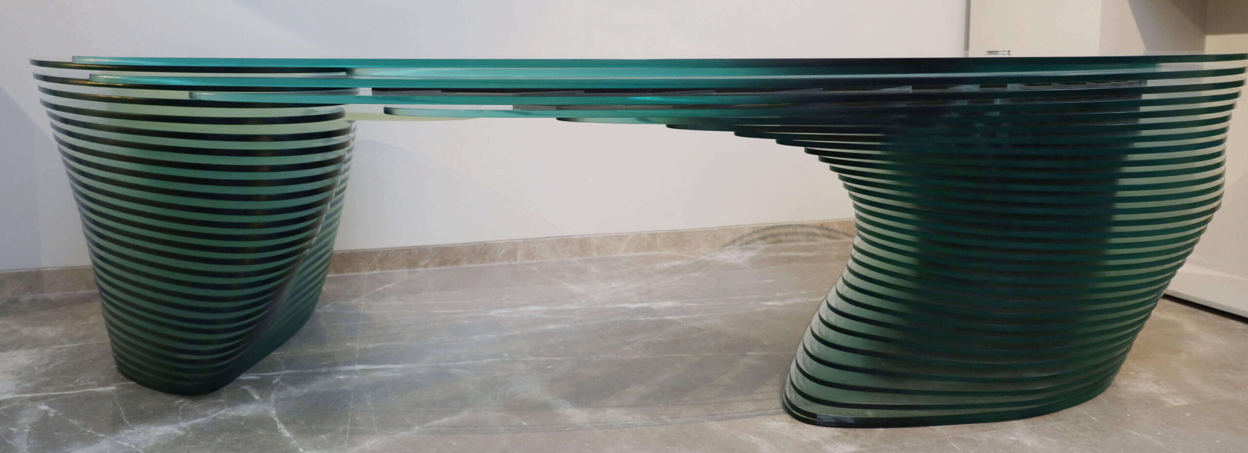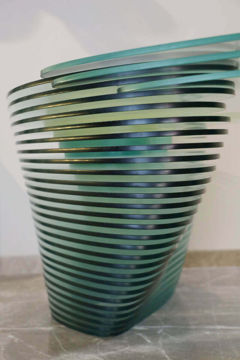 Aether’s form of 53 alternating layers of resin and glass defined to signify the nature of water: Fluidity, defies to make a key board shelf like ice defies the constrains of water.