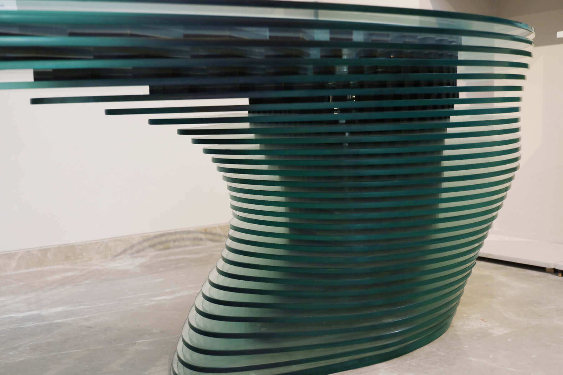 The pattern of 60 alternating layers of glass and 711 wood pieces composed in Terra is governed by a whole-number arithmetic progression that informs the rhythm of wood placement. This numerical logic translates cosmology into measurable order — a dialogue between metaphysics and parametric precision.