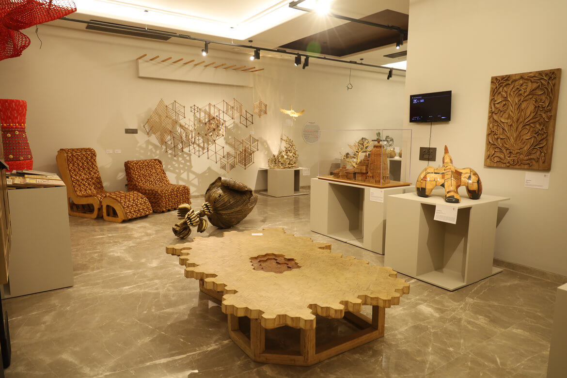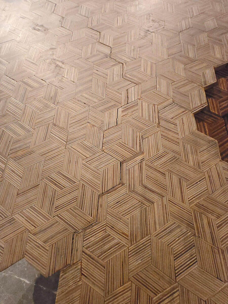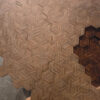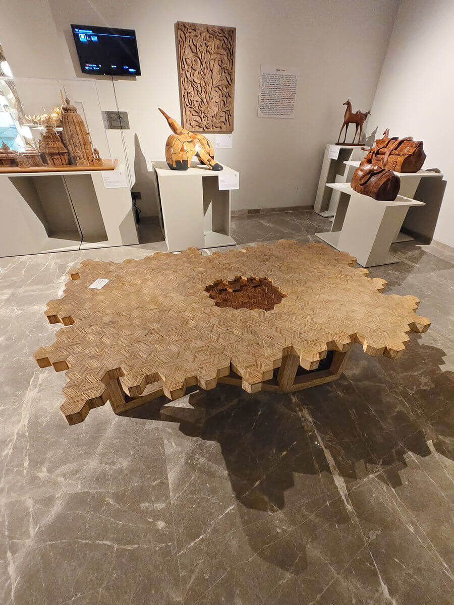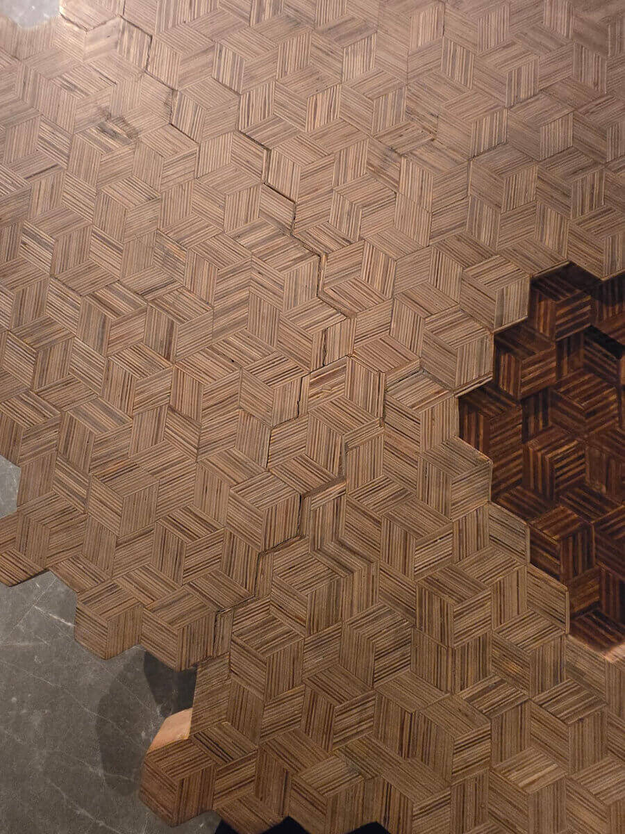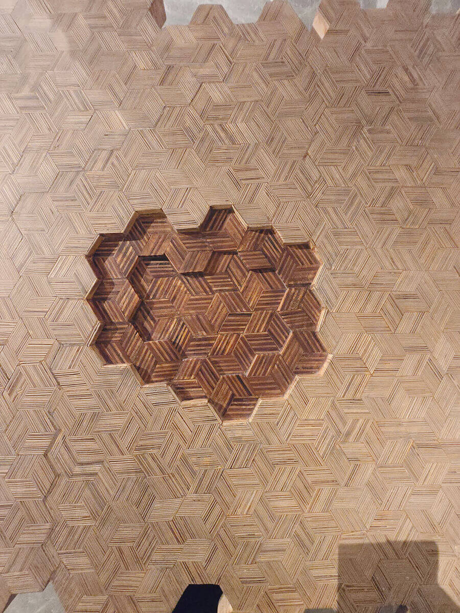 This intricate wooden installation transforms traditional craftsmanship into a contemporary spatial artwork. Composed of numerous precisely cut and assembled wooden units, the piece forms a sprawling geometric surface that resembles an organic, expanding landscape. Each segment is meticulously patterned, creating a rhythmic interplay of lines, angles, and textures that draw the viewer into its detailed surface.