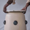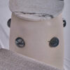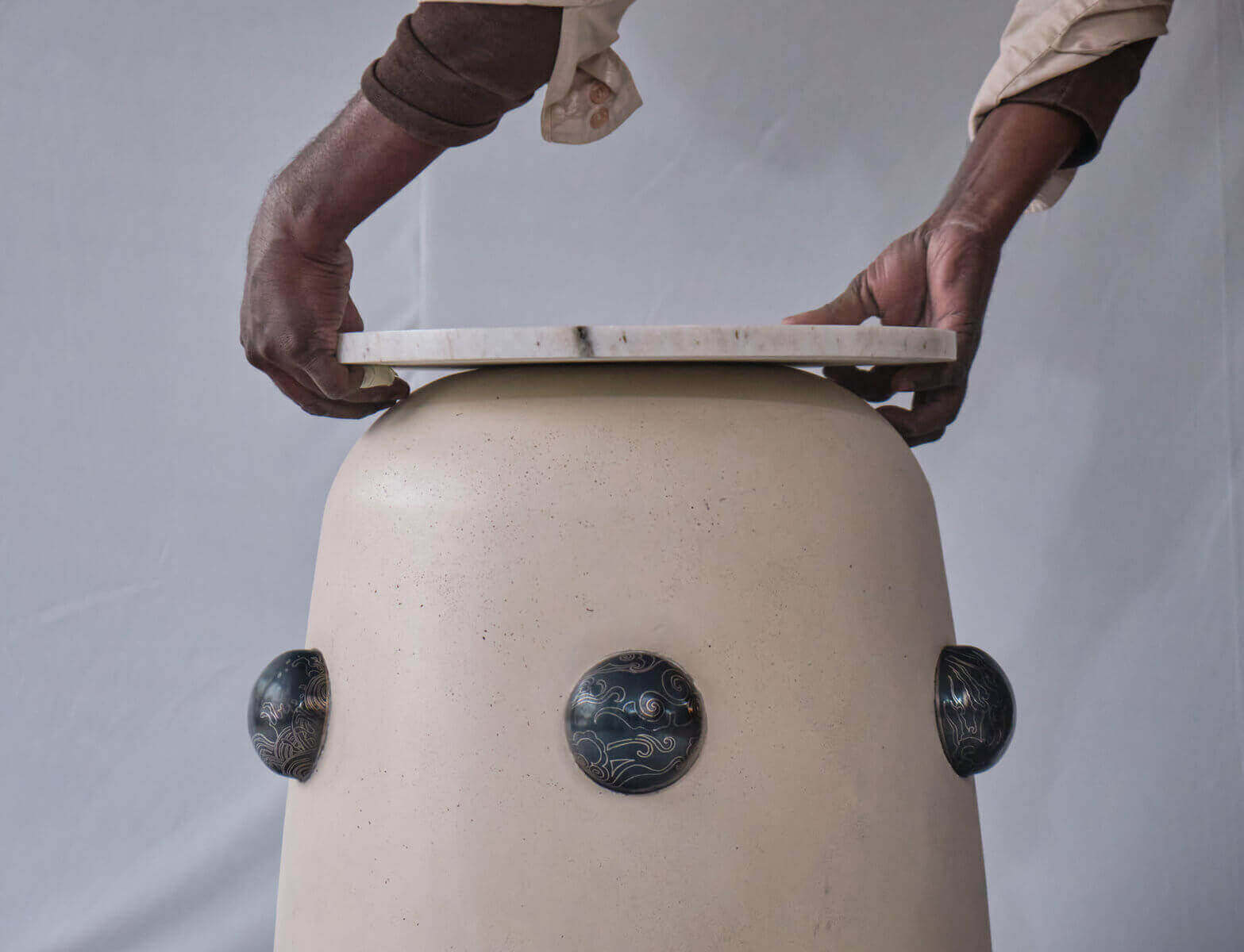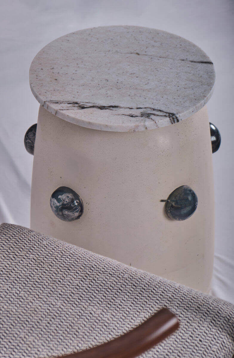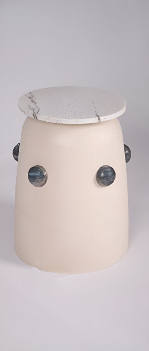 This contemporary sculptural table is a refined exploration of form, material, and minimal design. Featuring a smooth, cylindrical base in a soft matte finish, the piece exudes understated elegance while maintaining a strong visual presence. The body is punctuated with rounded stone-like inlays, creating subtle points of contrast and texture that enhance its artistic character.
