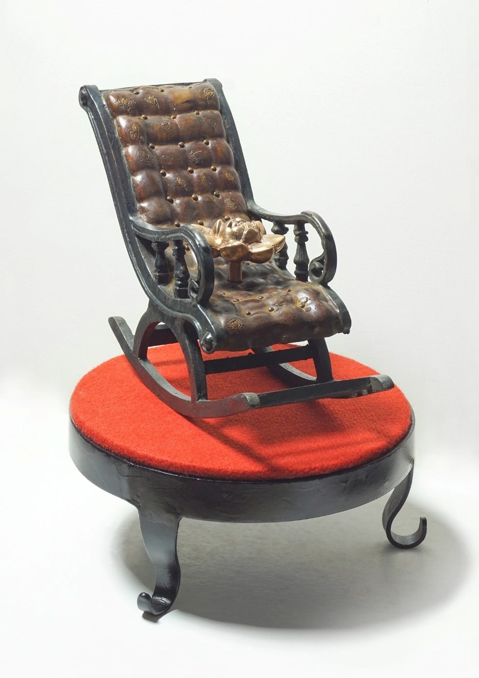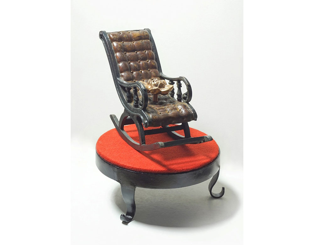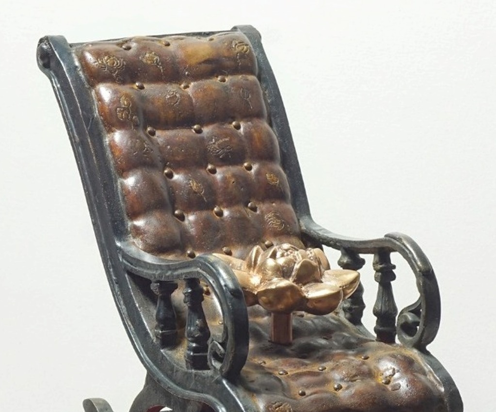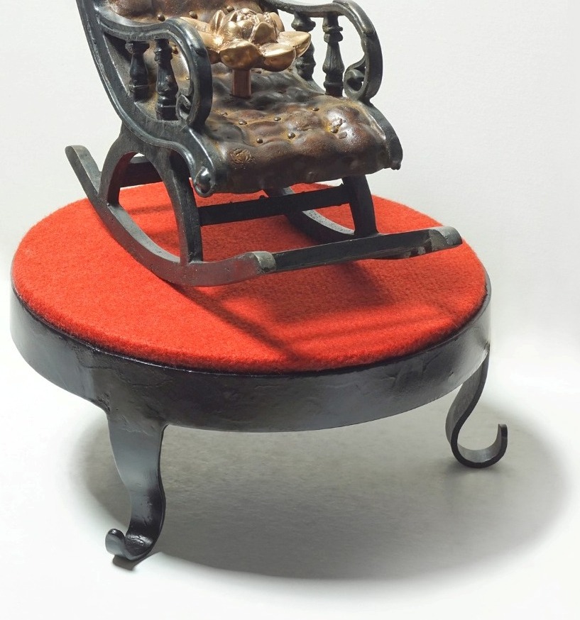 This bronze sculpture titled Power of Nation (2023) by Barun Pramanick, measuring 11 x 17 inches, is a thought-provoking work that blends symbolism with a sense of authority and reflection. The piece presents a finely detailed rocking chair, its surface padded and textured to resemble leather, placed atop a round pedestal covered in vibrant red fabric, symbolizing power, prestige, and sacrifice. Resting on the chair is a polished bronze lotus, an emblem of purity, resilience, and national identity. The juxtaposition of the comfortable, authoritative chair with the sacred lotus creates a dialogue between governance, tradition, and moral grounding, suggesting that true power lies not in dominance but in balance, wisdom, and rooted cultural values.