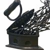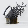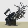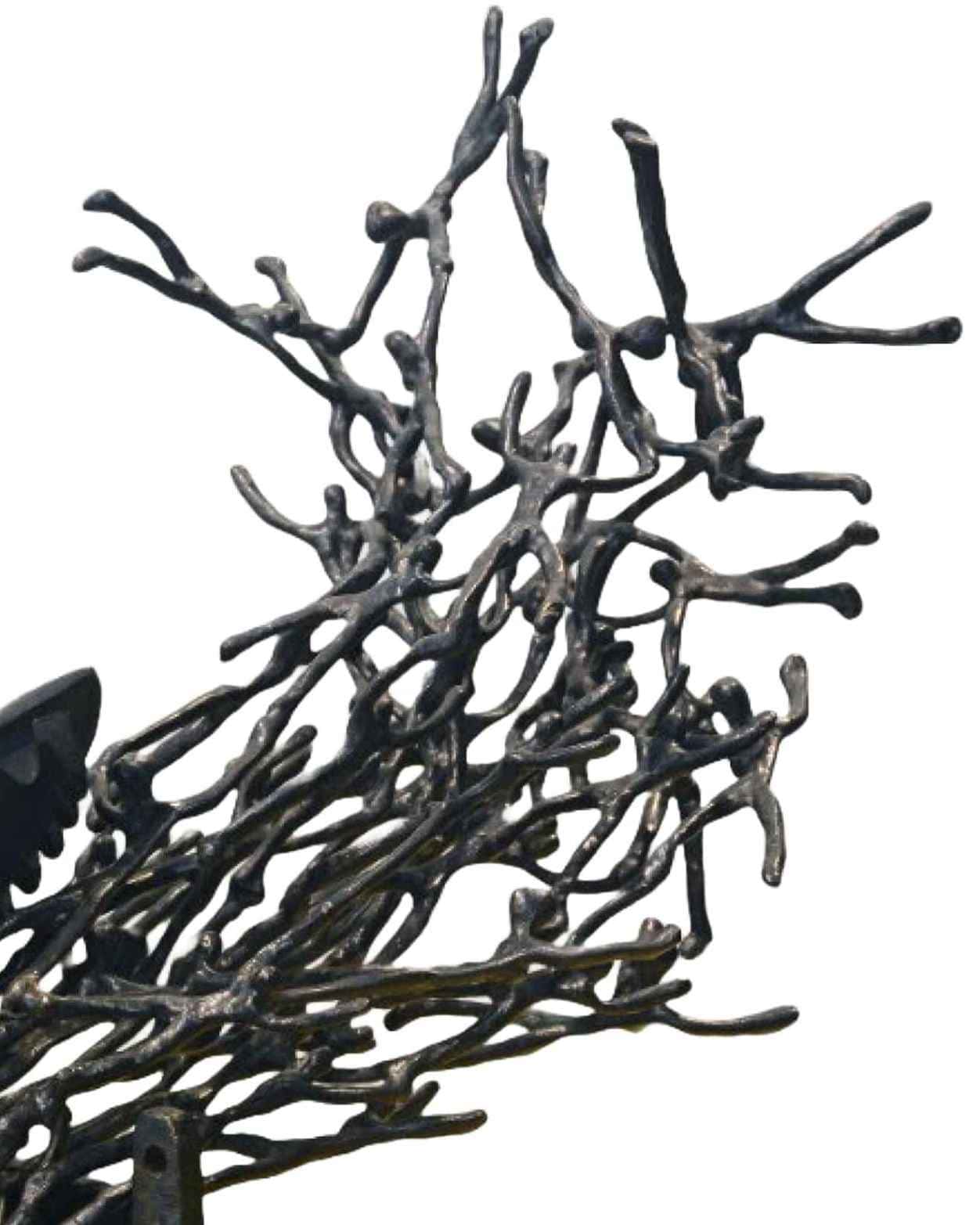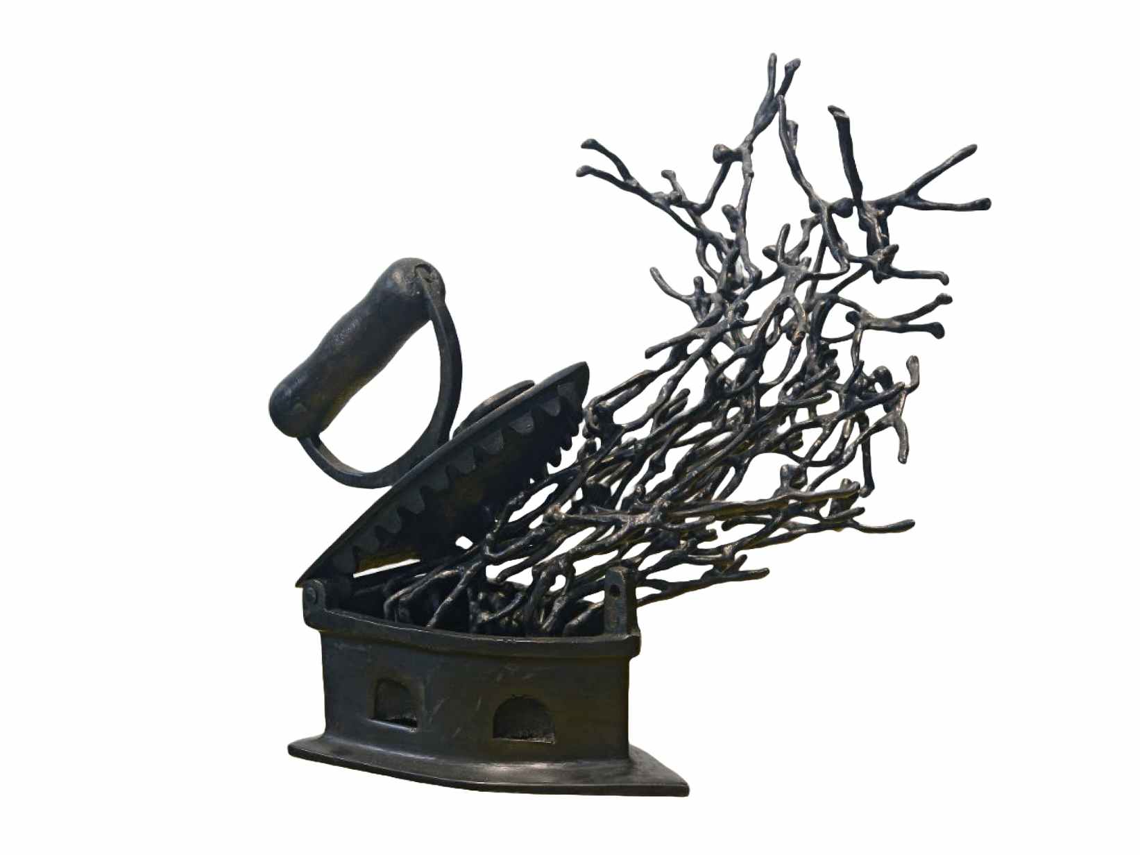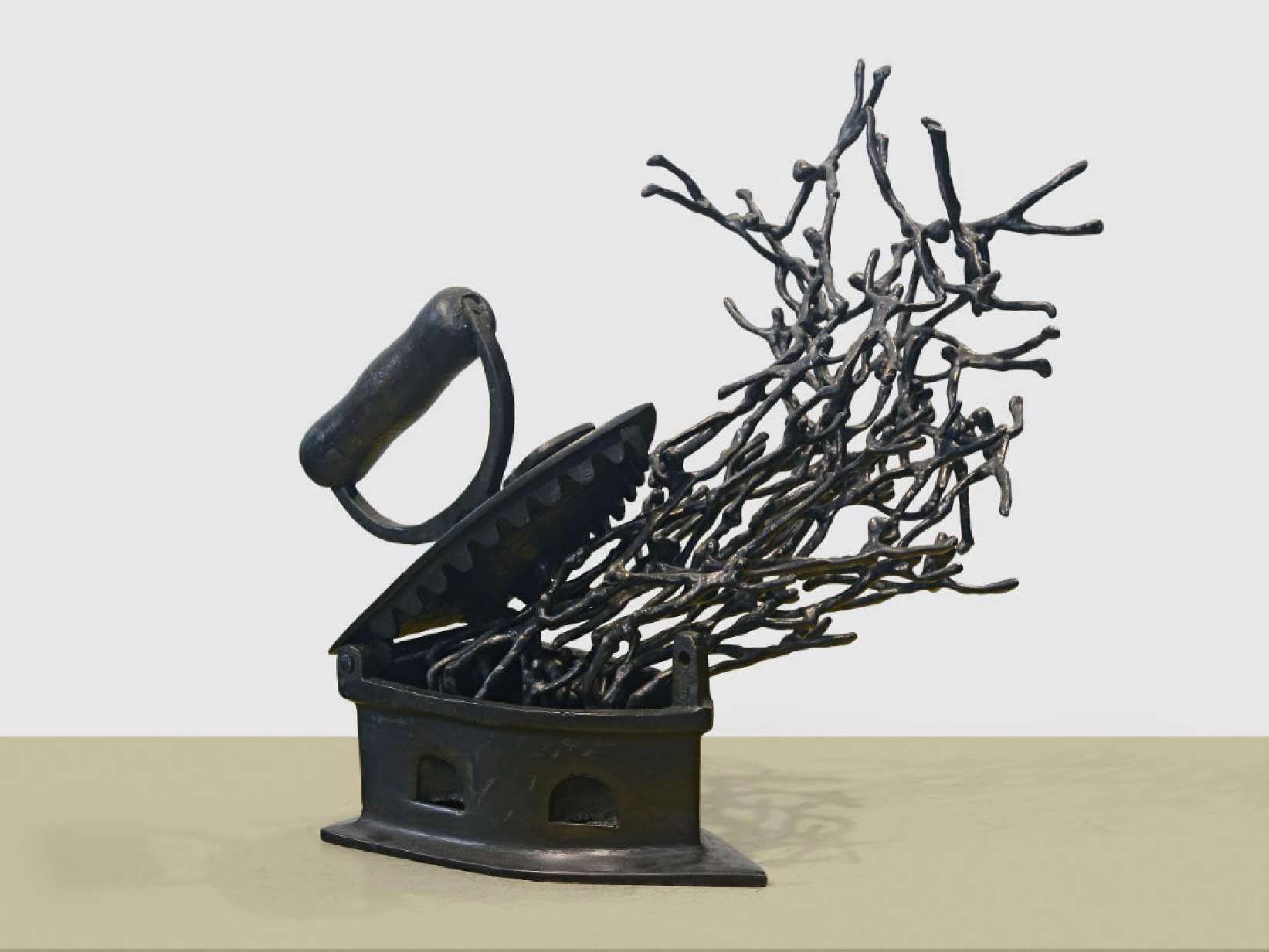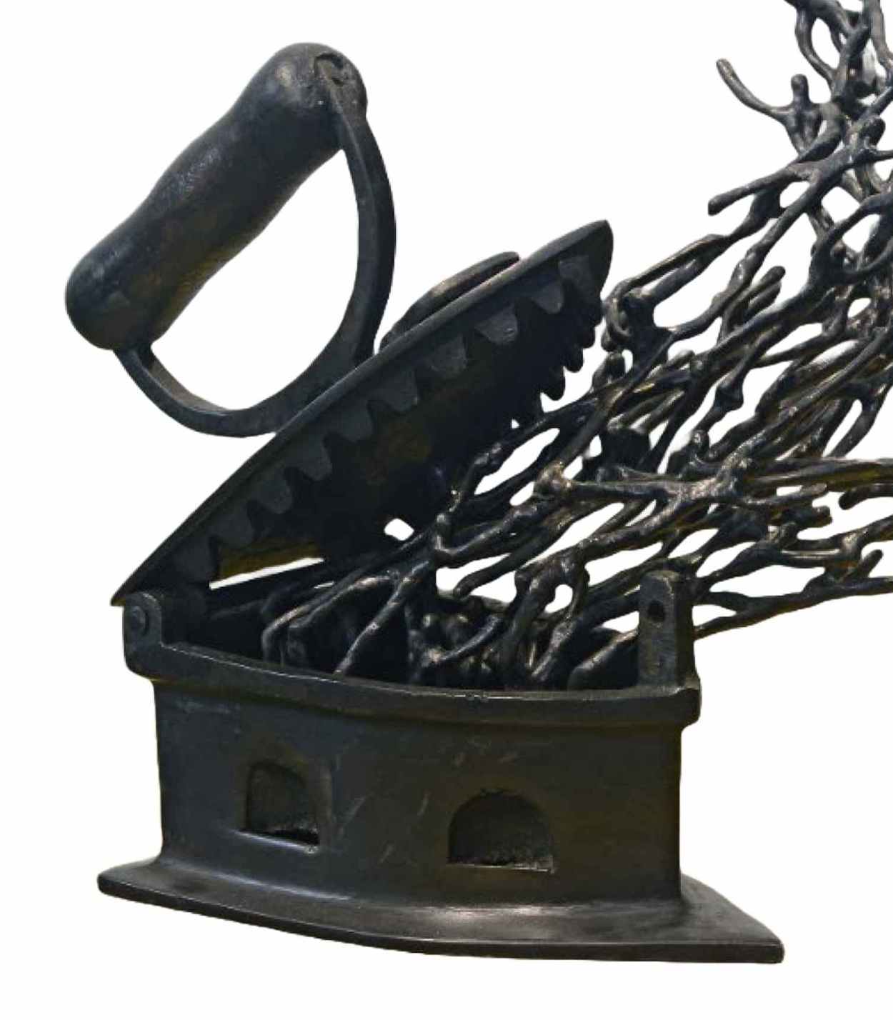 “Press 2 for…” by K.S. Radhakrishnan is a 2018 bronze sculpture where a vintage iron releases a flurry of intertwined human forms, symbolizing transformation, energy, and the enduring spirit within ordinary objects.