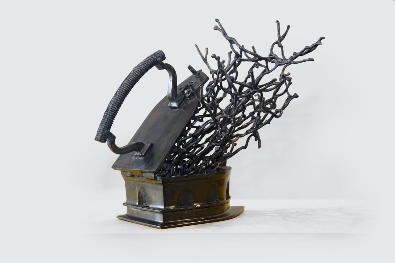 This bronze sculpture, titled “Press 2 for…” (2018) by noted sculptor K.S. Radhakrishnan, transforms an old-fashioned coal iron into a metaphorical stage for movement and vitality. Emerging from the open iron is a dynamic cluster of intertwined, human-like figures—an iconic motif in Radhakrishnan’s oeuvre—that seem to dance and surge forward. The work blends domestic nostalgia with lyrical abstraction, suggesting themes of transformation, labor, and the invisible human spirit that fuels everyday life. Through this interplay of form and meaning, the artist elevates a common household tool into a timeless symbol of energy and creation.