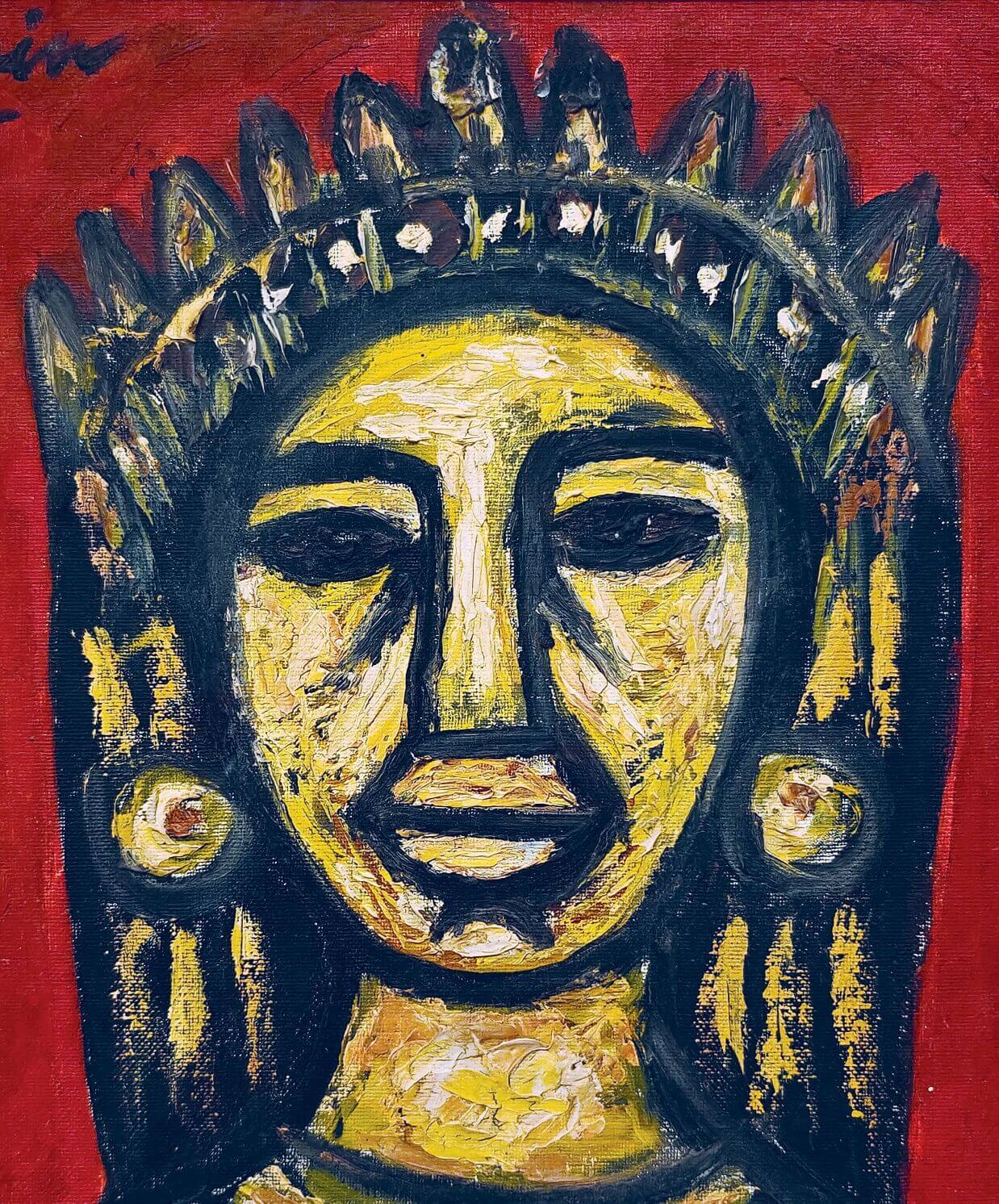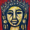 This painting, Queen (2015) by Rabin Mondal, radiates a commanding yet introspective presence, reflecting the artist’s deep exploration of human dignity and fragility. The figure of the queen, portrayed with a solemn expression and crowned head, stands against a bold red background that heightens the intensity of her gaze. Her face, rendered in thick impasto strokes of yellow and black, carries both regality and weariness — as if she bears the weight of her crown and the burdens of power alike. The textured brushwork and earthy palette give the painting a raw, sculptural quality, emphasizing emotion over realism. Mondal’s queens, like his kings, often transcend literal royalty; they symbolize endurance, inner strength, and the quiet resilience of the human spirit amidst turmoil. Through this work, the artist transforms the image of a monarch into a universal symbol of struggle, pride, and the unyielding quest for dignity.